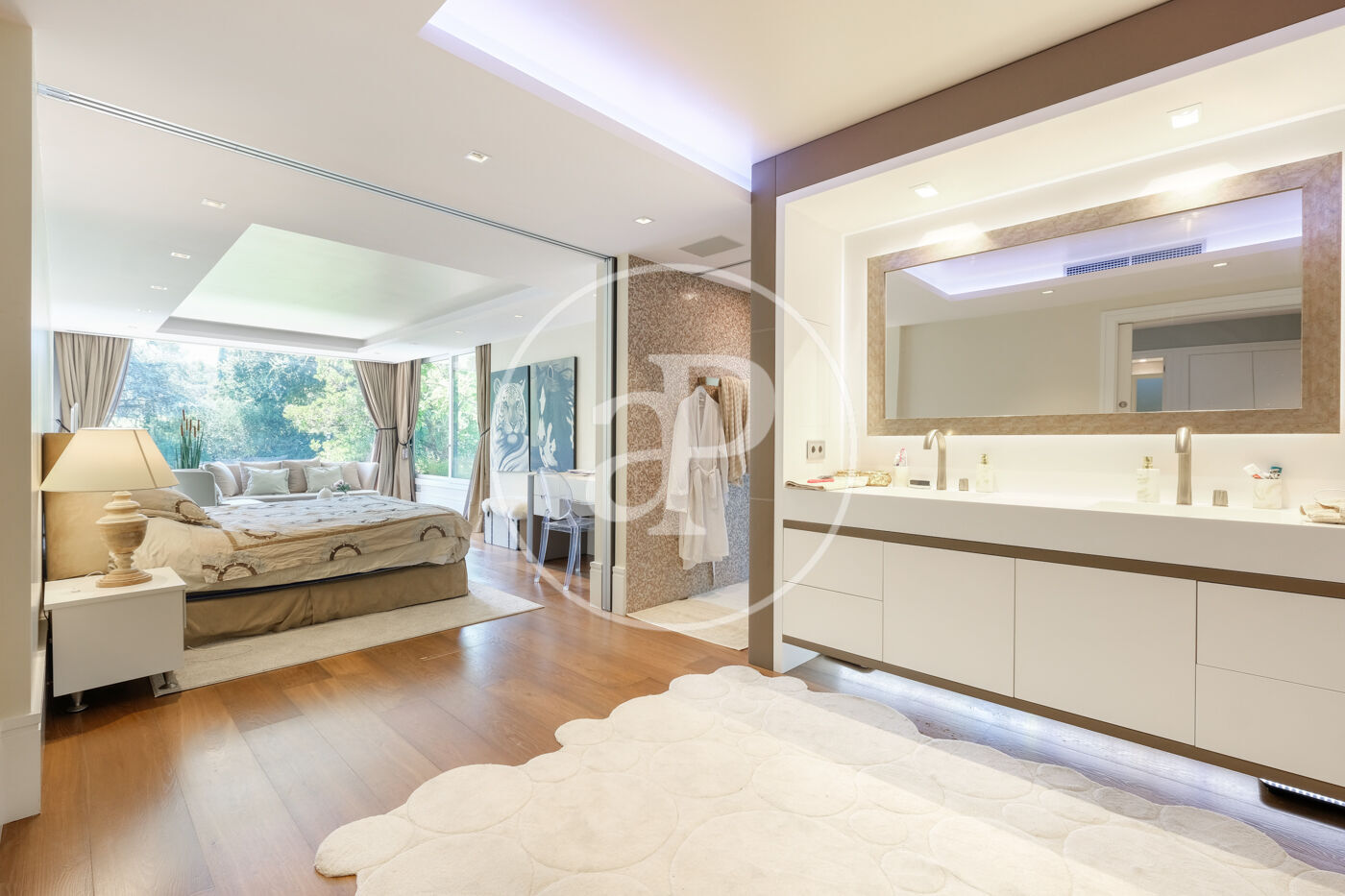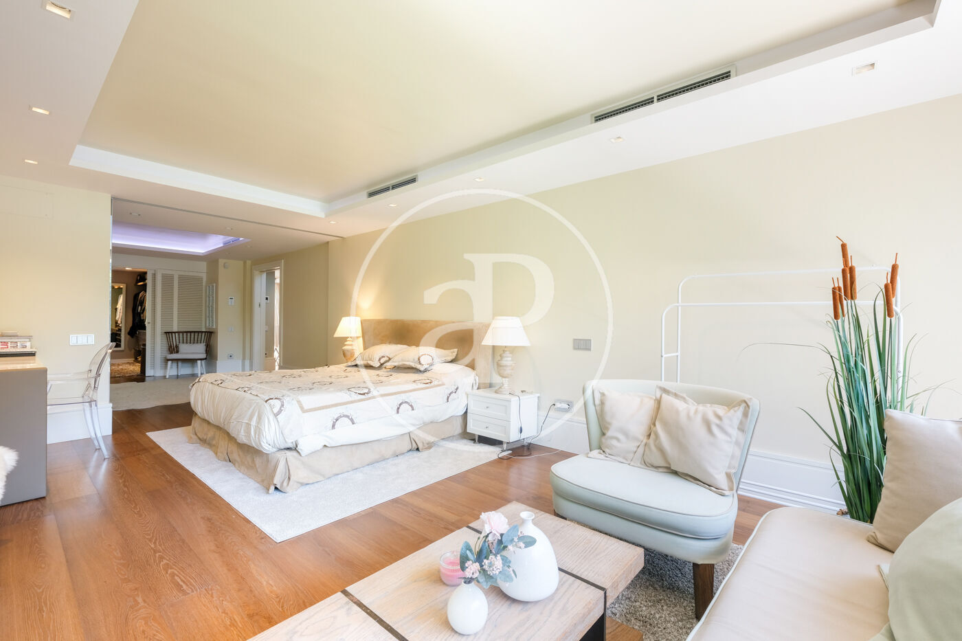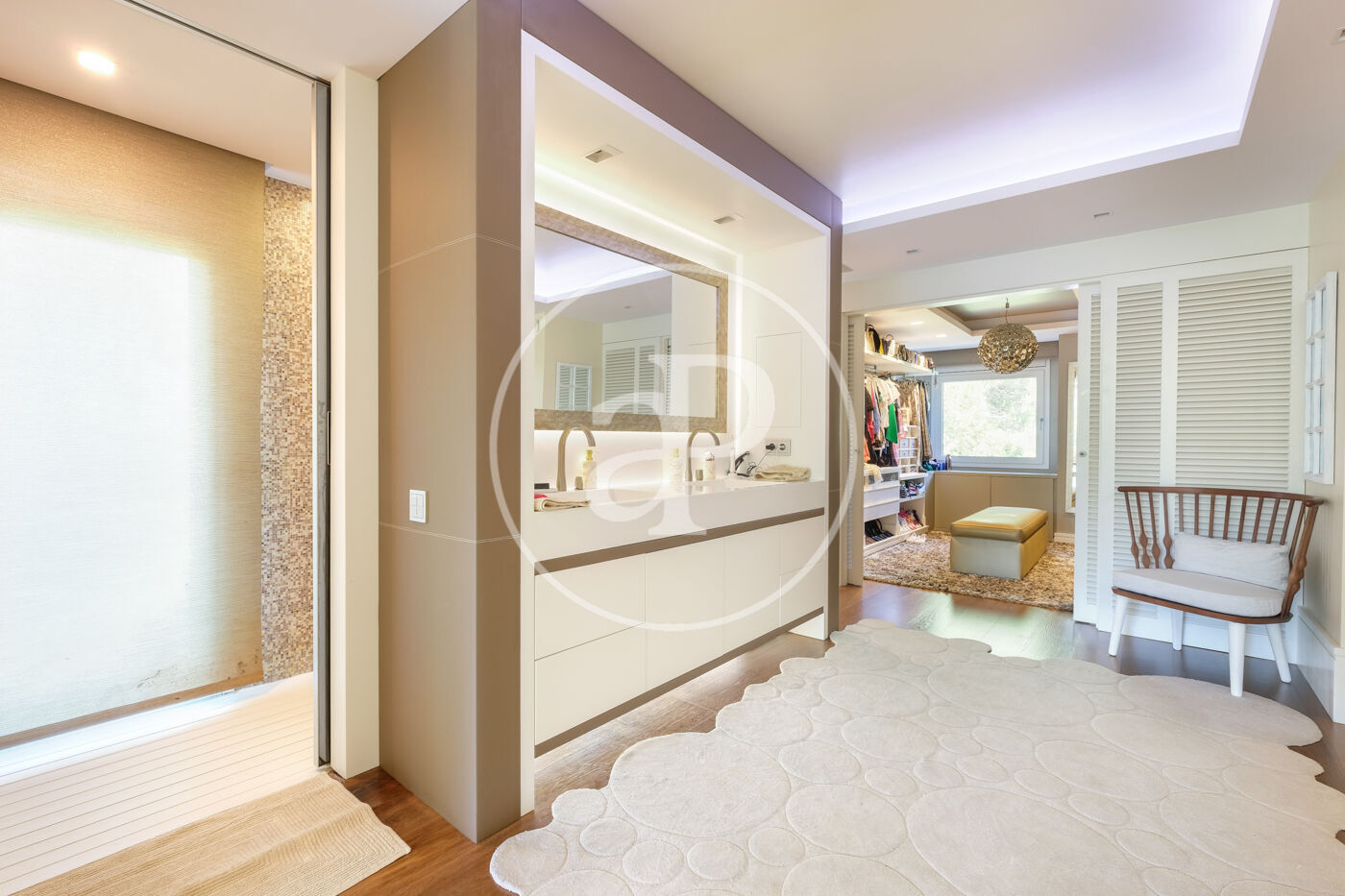 Desde el vestíbulo accedemos por las bonitas escaleras a la zona de noche, compuesta por 4 amplias habitaciones exteriores con armarios empotrados. La máster suite goza de 60 m2 y preciosas vistas al jardín privado y al Golf, baño de diseño, vestidor amplio y zona de lectura o relax junto al ventanal. Las otras 3 habitaciones comparten un amplio y precioso baño completo.