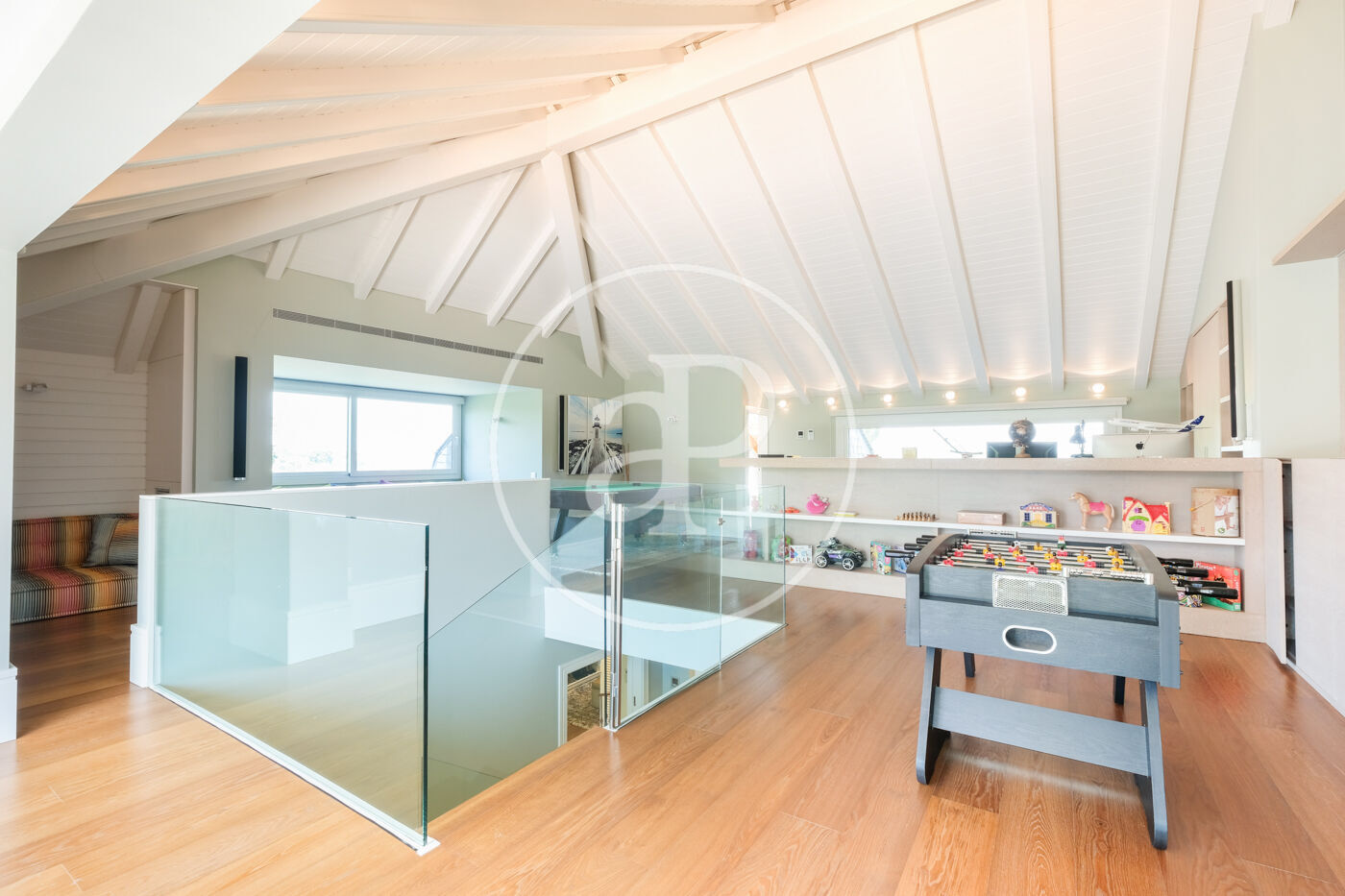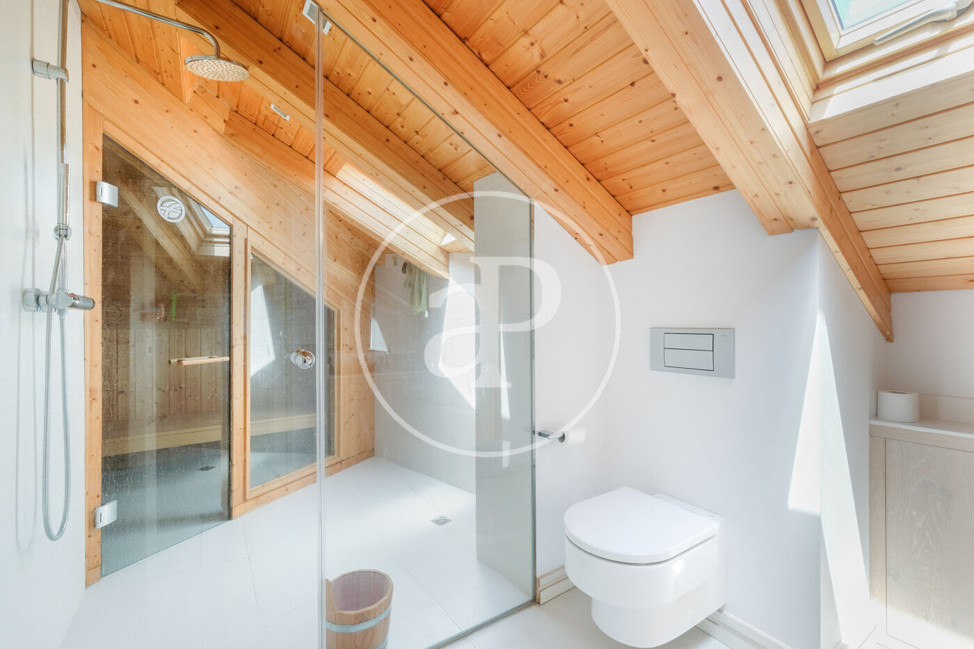 En la planta superior encontramos la preciosa sala polivalente abuhardillada de techo alto, con fantásticas vistas y distintos espacios dedicados actualmente a sala de estar, oficina y gimnasio, además encontramos un baño con sauna y una terraza de 17 m2.