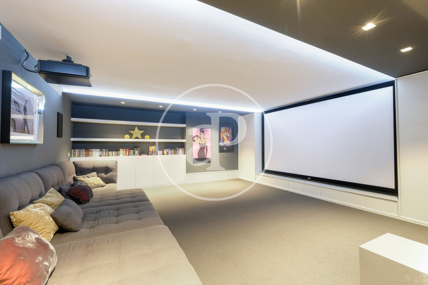 En la planta inferior la espectacular sala de cine insonorizada, habitación completa para el servicio, trastero, zona de armarios y garaje para 3 coches y motocicletas, además de poder aparcar en la zona exterior.