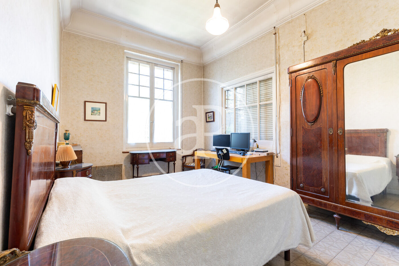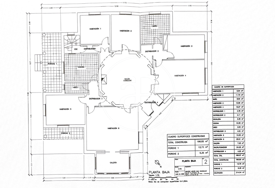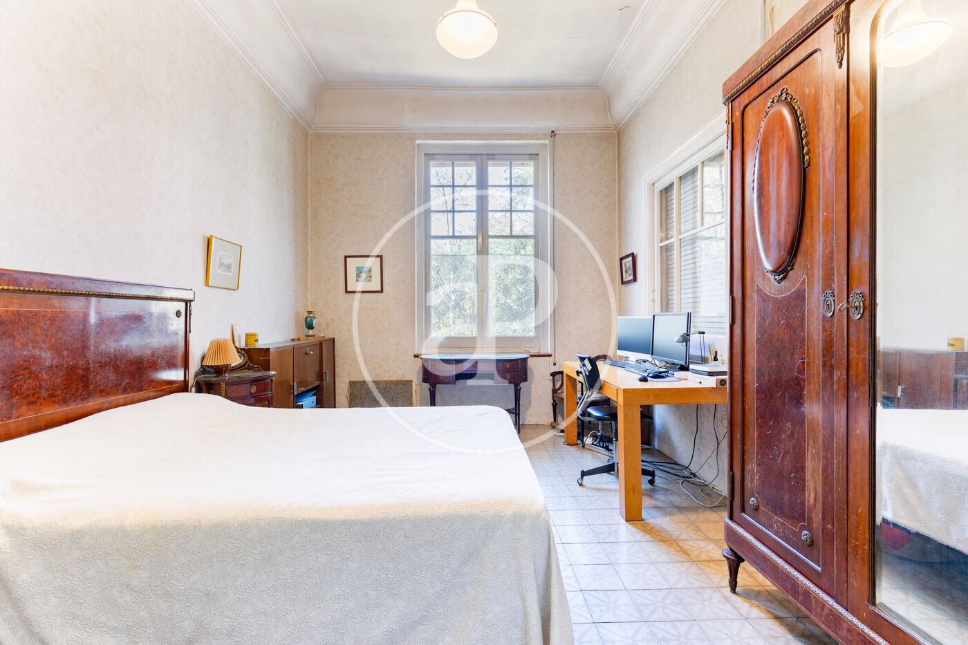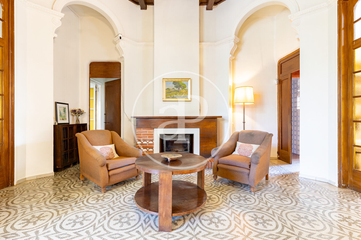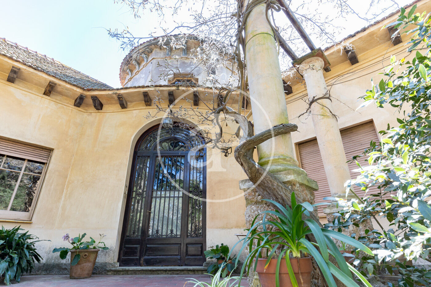 Un elegante salón actúa como punto de encuentro que define la distribución de toda la planta comunicando a todos los ambientes de la casa, salón, comedor, cocina y cinco habitaciones con un par de baños que las sirven. Todos los ambientes de esta planta tienen doble altura y se conectan con el jardín por grandes ventanales estilo modernista. En la planta superior, se encuentran diferentes salas, ampliaciones realizadas y declaradas por los propietarios actuales. La casa ofrece una construcción auxiliar de 80 m², actualmente parking y sala polivalente. En el sótano se desarrolla toda el ala de servicio, bodegas y trasteros.