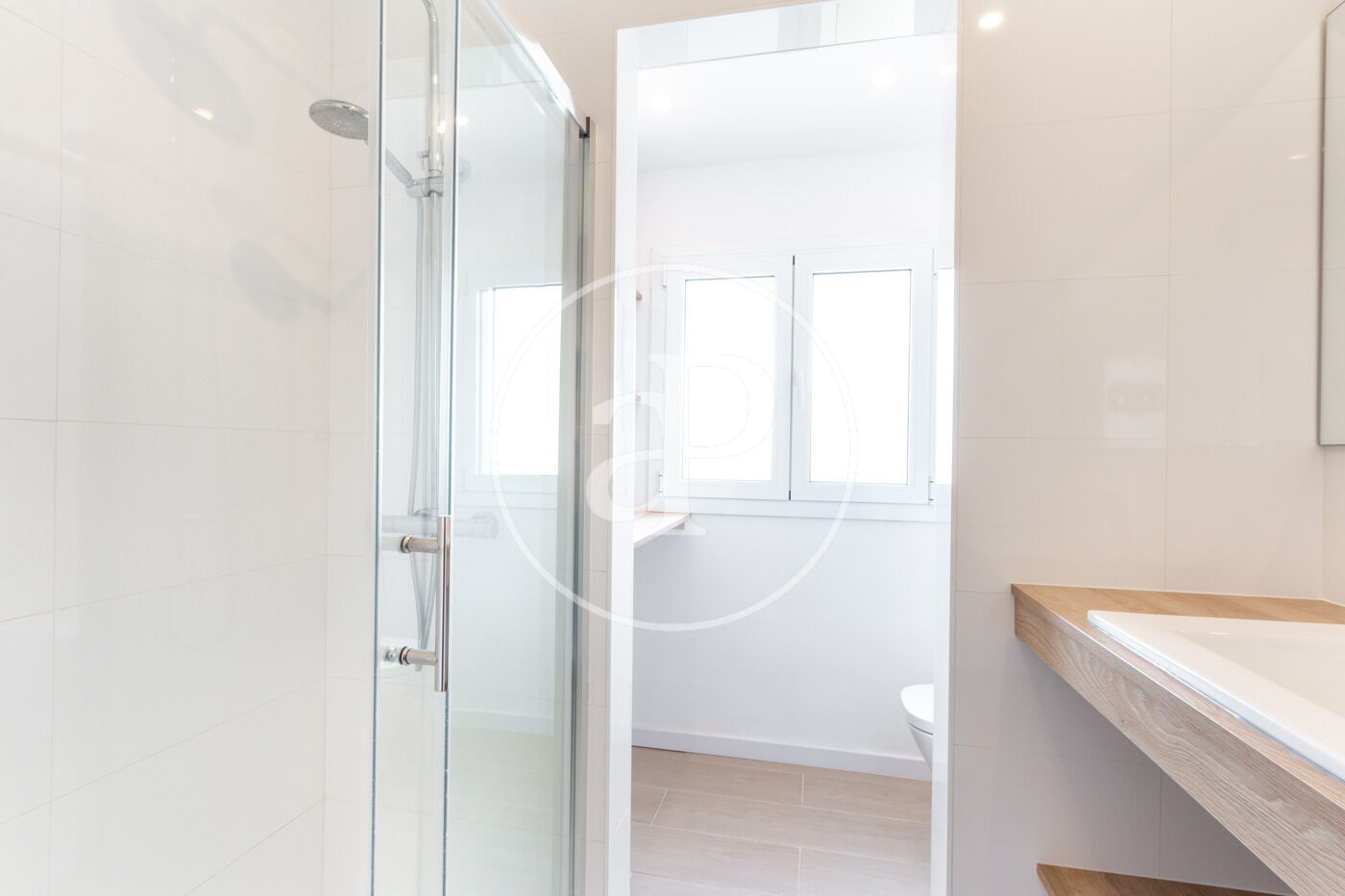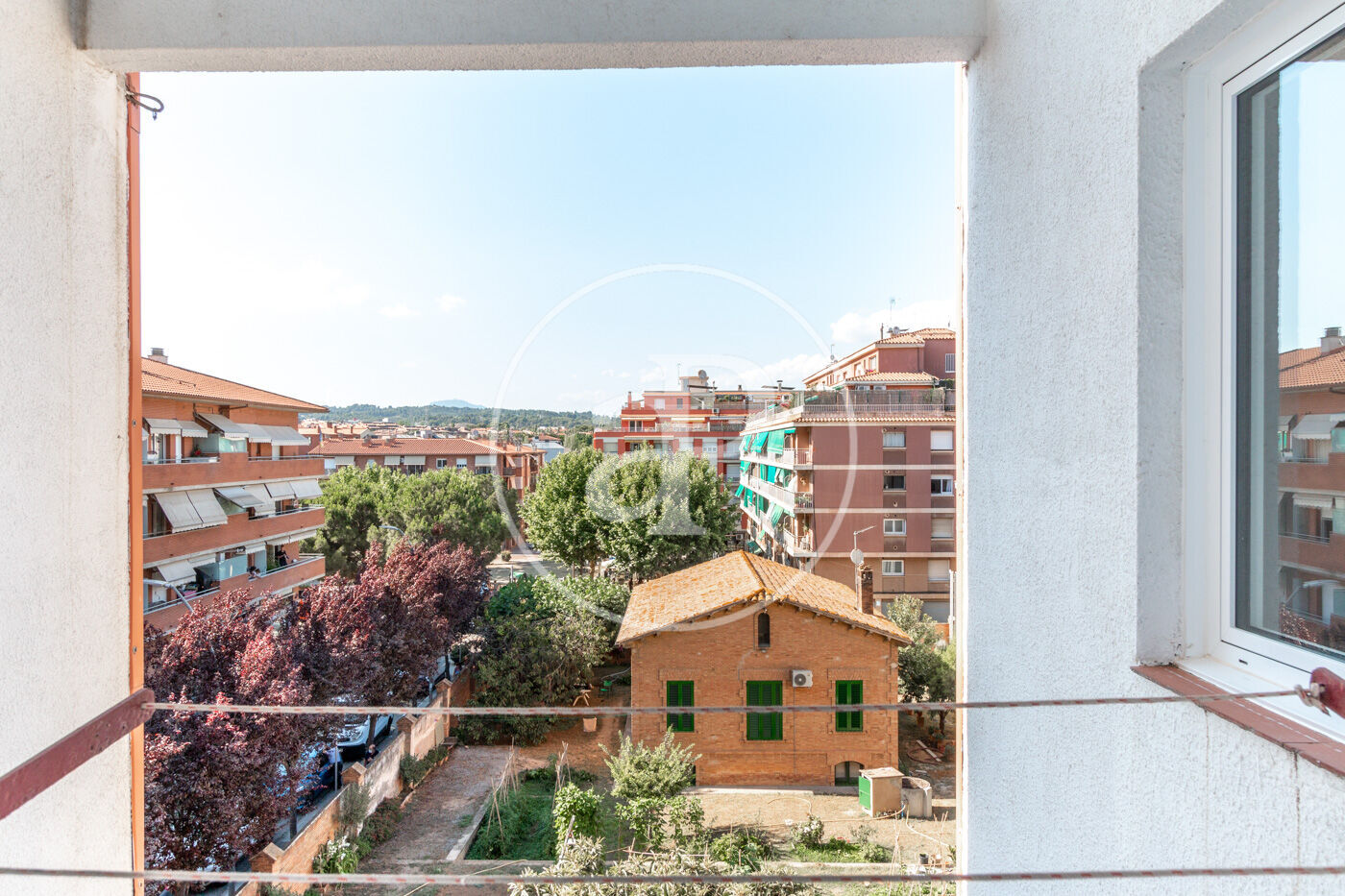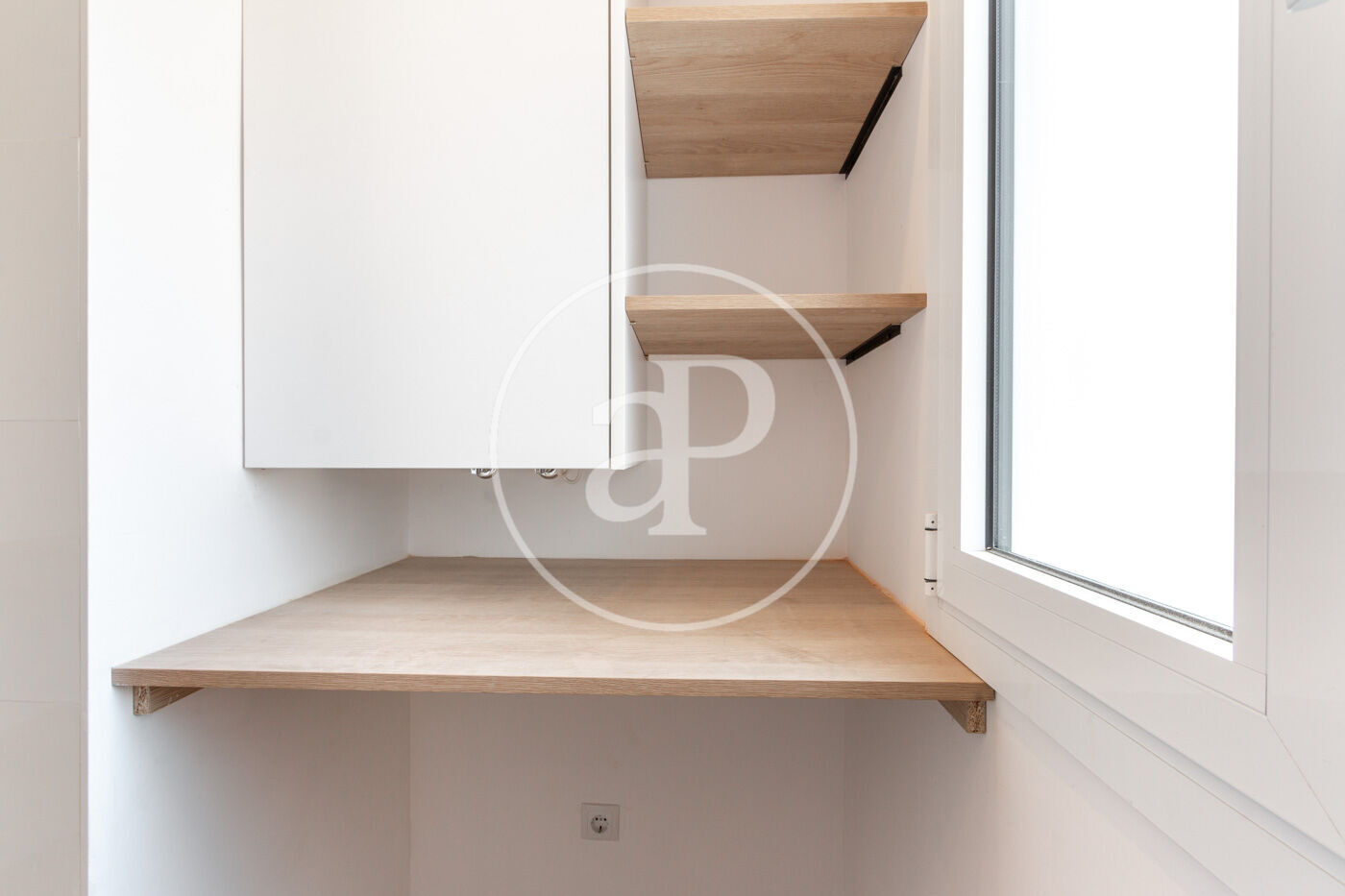 Siguiendo por el pasillo, a la derecha encontramos el baño con ducha, hueco para lavadora y vistas a La Mola. Si continuamos por el pasillo, accedemos a la cocina la cual dispone de abundante luz natural.