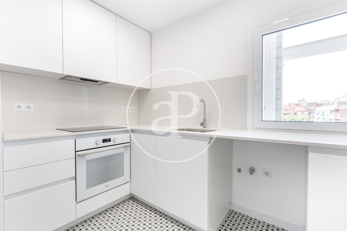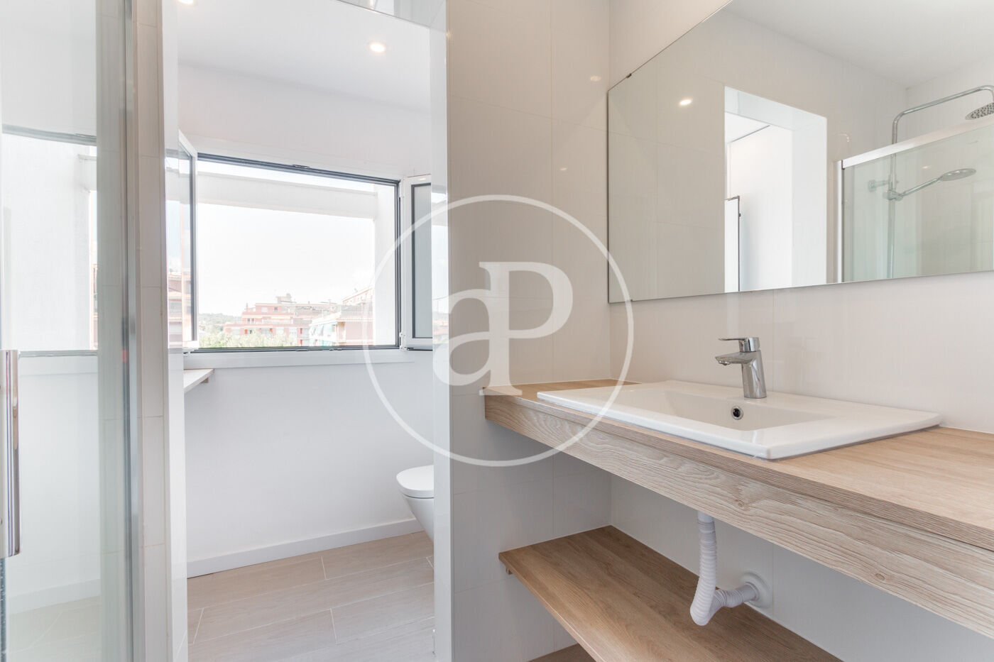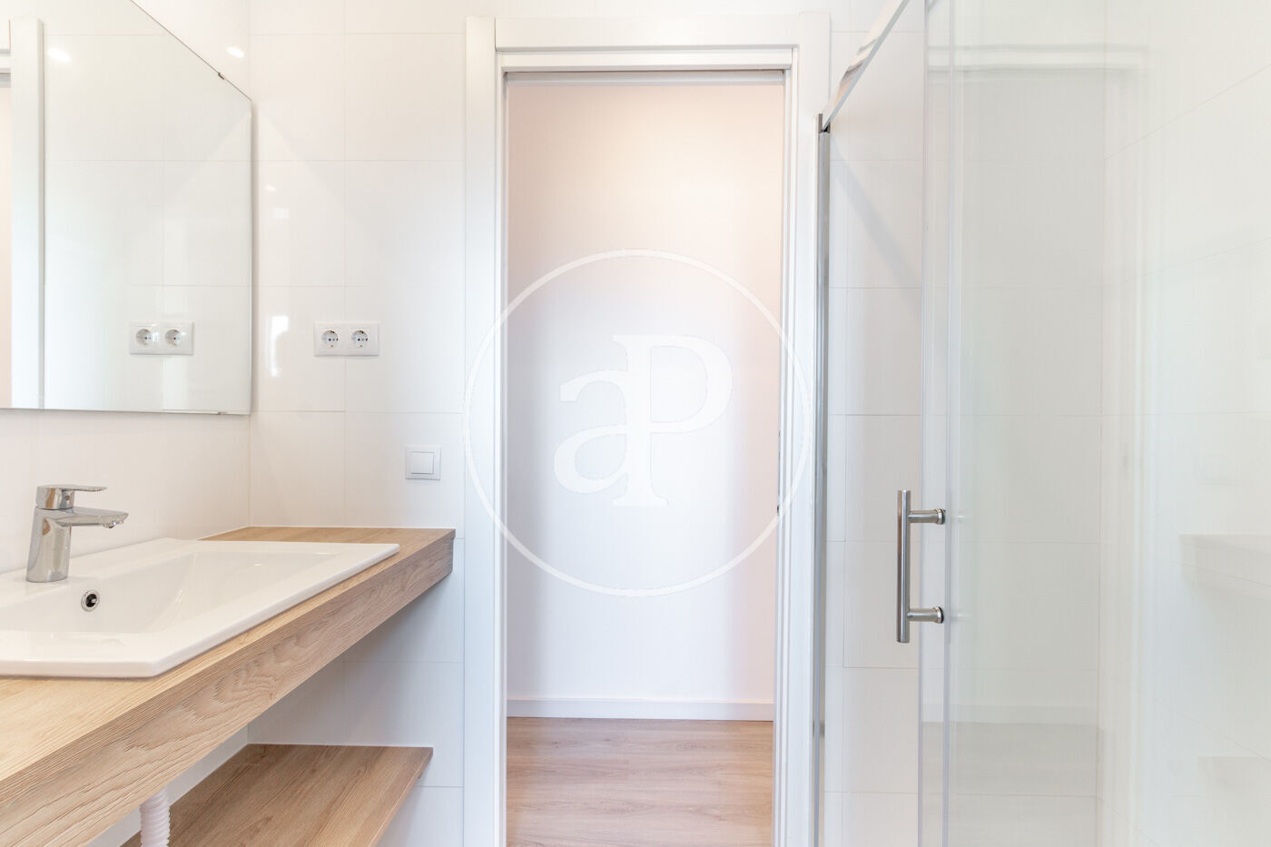 Siguiendo por el pasillo, a la derecha encontramos el baño con ducha, hueco para lavadora y vistas a La Mola. Si continuamos por el pasillo, accedemos a la cocina la cual dispone de abundante luz natural.