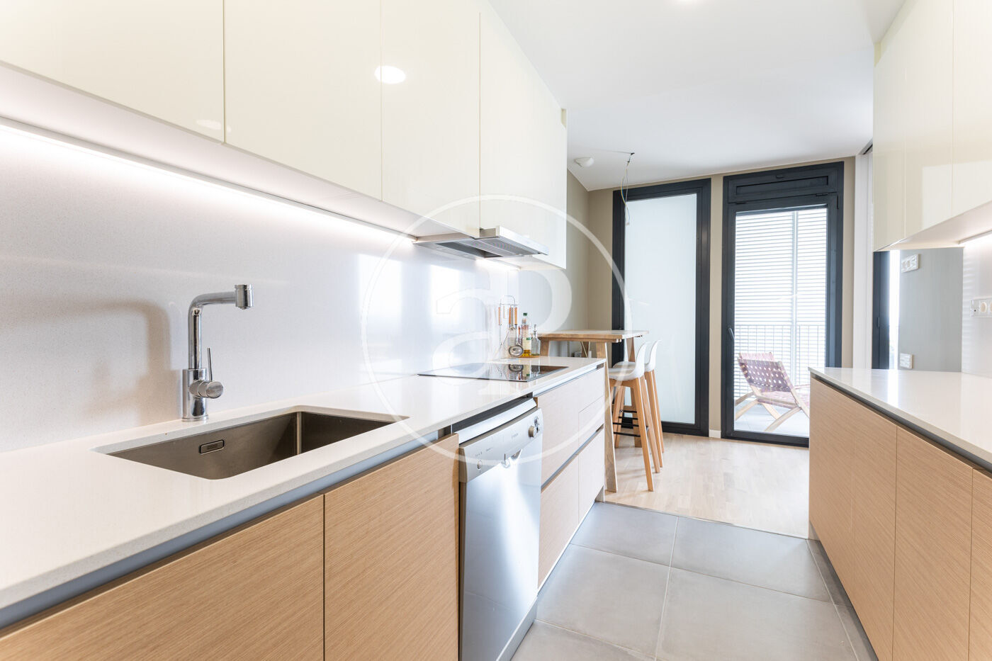 Este inmueble a estrenar se caracteriza por contar con un amplio salón-comedor amueblado luminoso que se conecta con una terraza soleada. La cocina sin equipar se une directamente al salón-comedor a través de un espacio para desayunos que se puede abrir o cerrar mediante una corredera.