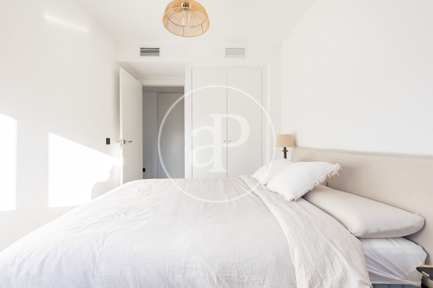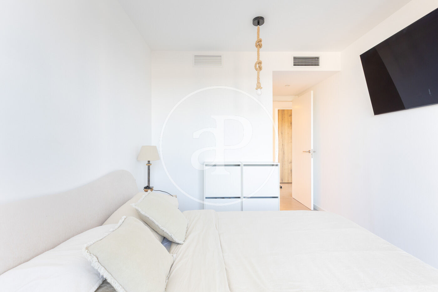 Accedemos a la vivienda por el recibidor. A mano izquierda encontramos una habitación doble, con armario empotrado y una pequeña antesala y gran ventanal. En frente, un baño completo. Enfrente accedemos la gran sala de estar, con la cocina abierta al salón comedor y la gran terraza, con su zona de comedor exterior y zona de sofás chill out para disfrutar del aire, las fantásticas puestas de sol y las vistas a la montaña. Es la zona de dia ideal para pasar grandes momentos con familia y amigos. Finalmente encontramos la máster suite, con su vestidor y baño completo.