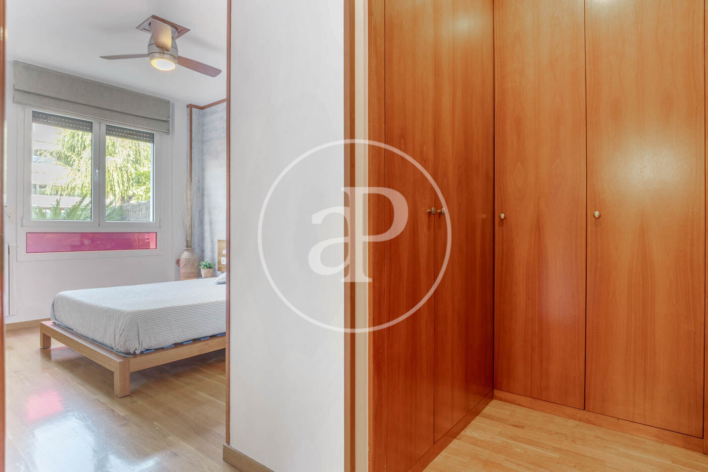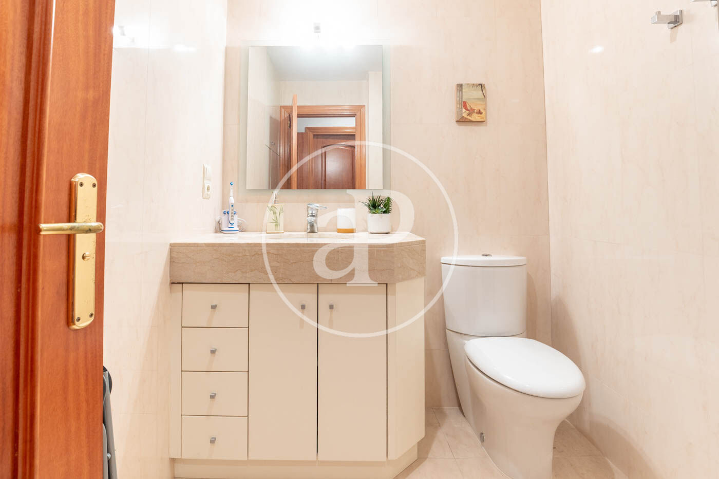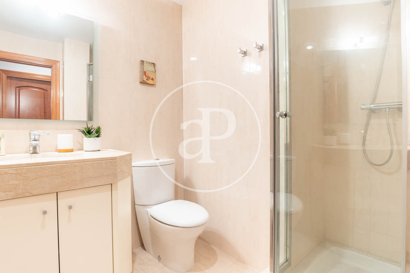 El piso cuenta con 2 baños completos y 2 habitaciones dobles, una de ellas máster suite (con su propio baño y vestidor) y jardín de 20m2, así como de 1 plaza de parking y trastero anejo especialmente grande.