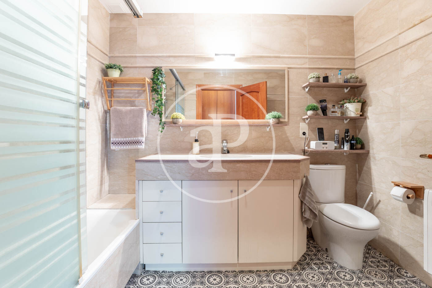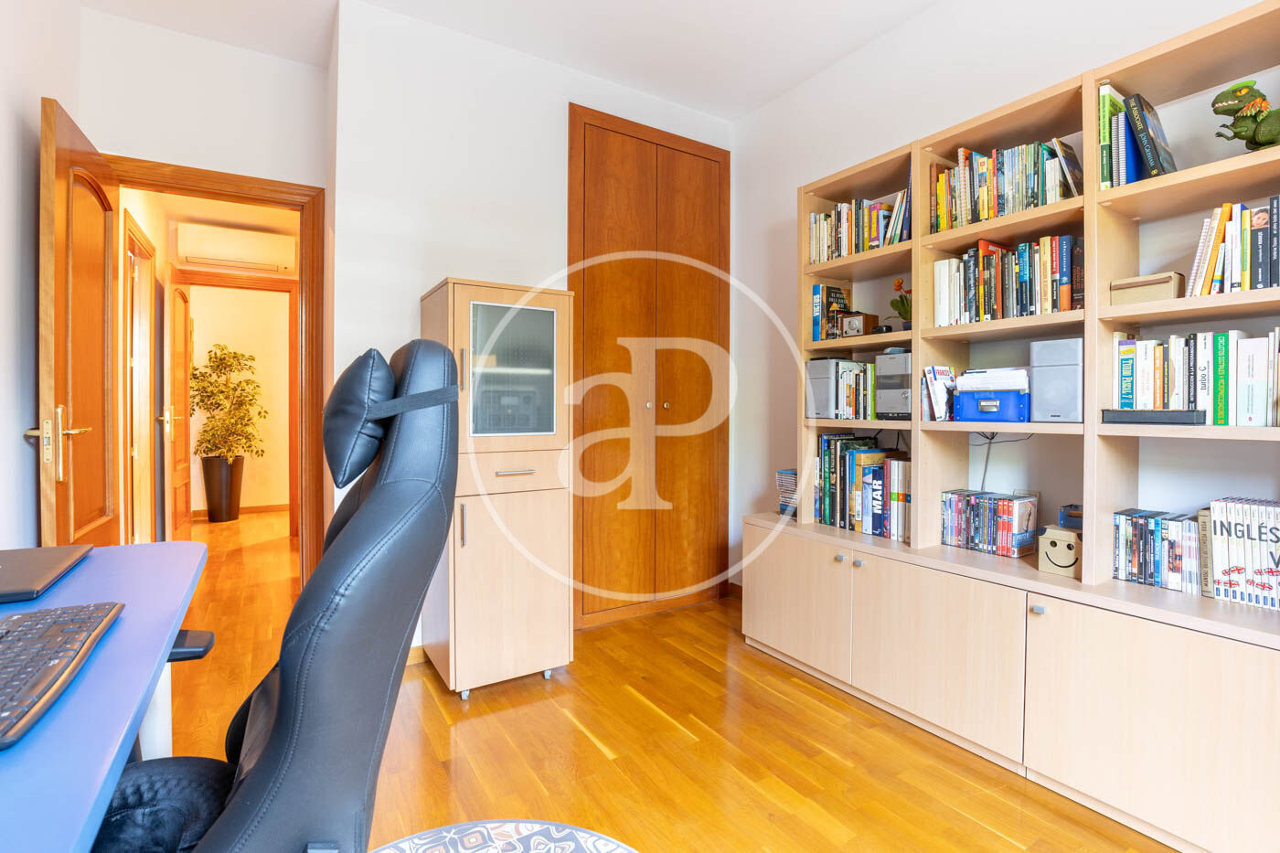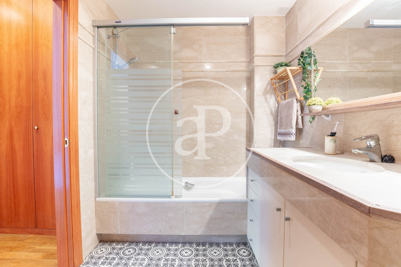 El piso cuenta con 2 baños completos y 2 habitaciones dobles, una de ellas máster suite (con su propio baño y vestidor) y jardín de 20m2, así como de 1 plaza de parking y trastero anejo especialmente grande.