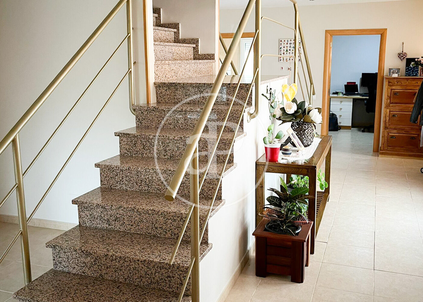 El diseño de la casa destaca por sus amplias escaleras y generosos espacios abiertos, que favorecen la sensación de amplitud en cada rincón. Además, el exterior de la propiedad no se queda atrás: la parcela cuenta con árboles frutales, un toque especial que añade un aire mediterráneo a los jardines que rodean la casa.