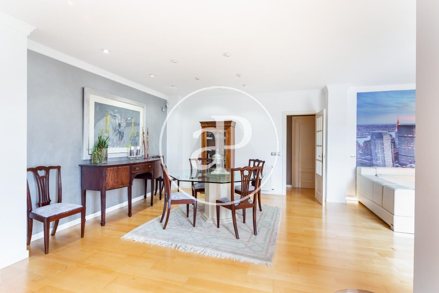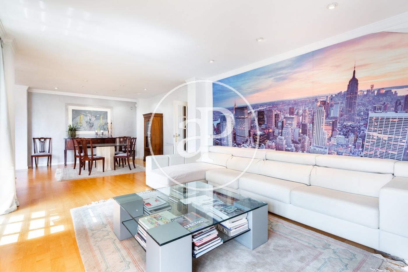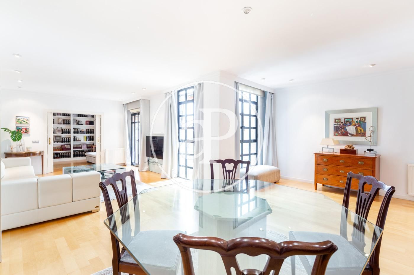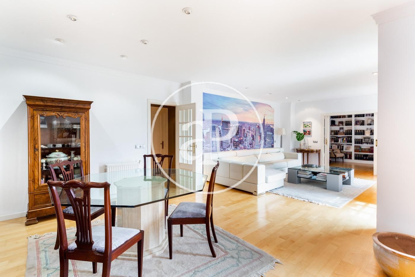 Destaca, por supuesto, de esta singular propiedad, el amplio y lujoso salón comedor dividido en dos estancias, la primera con una mesa de cristal acompañada con sillas de estilo, un gran sofá para el relax e ideal para el descanso familiar. Unida a esta, se encuentra la zona de la biblioteca, en un ambiente tranquilo y luminoso. Todas las estancias de este inmueble son exteriores.