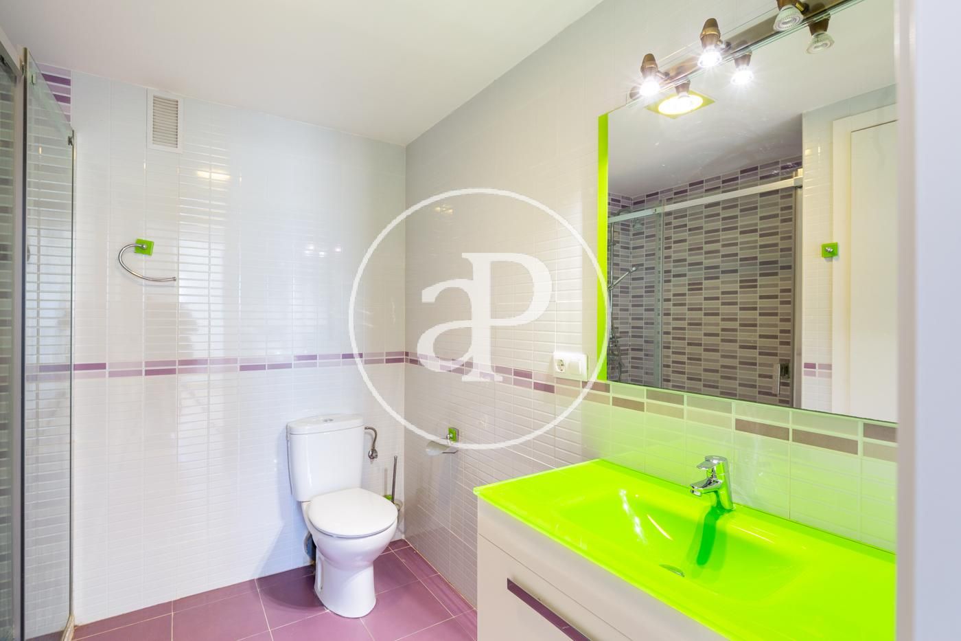 Este impresionante ático de 165 m² ha sido completamente reformado con un diseño de autor, combinando confort, sostenibilidad y tecnología. Equipado con placas solares, suelo radiante y semi-domótica, ofrece una experiencia única de habitabilidad. Distribución y espacios 3 dormitorios con amplios armarios empotrados. 3 baños de diseño con grifería Grohe y sanitarios Roca, incluyendo un en-suite con ducha doble, otro con bañera de hidromasaje y un tercero con ducha tradicional. 2 salones: el principal con cocina integrada y grandes ventanales de techo a suelo, y el secundario con chimenea tipo cassette y acceso directo a la terraza. Terraza ático con sistema de riego por goteo y ducha exterior, perfecta para relajarse al aire libre. Cocina totalmente equipada, integrada al salón principal y diseñada para disfrutar de la luz natural. Confort y tecnología Aire acondicionado por conductos y suelo radiante, garantizando el máximo confort térmico en cualquier época del año. Ventanas mecanizadas y video portero inteligente dentro de un sistema semi-domótico. Plaza de garaje con posibilidad de instalar un punto de recarga para vehículos eléctricos o híbridos enchufables (según disponibilidad). Trastero incluido para mayor almacenamiento. Ubicación privilegiada Situado en una zona tranquila con excelente comunicación y acceso rápido a la M-30, M-40, A-2 y el Aeropuerto. A pocos minutos a pie encontrarás: Metro y autobuses urbanos/interurbanos. Zonas verdes como el Parque Juan Carlos I, El Capricho y Juan Pablo II. Centros comerciales y servicios: Hipercor, El Corte Inglés, Mercadona, farmacias y tiendas de barrio. Hospitales y colegios públicos, privados e internacionales. Una vivienda única que combina diseño, sostenibilidad y ubicación inmejorable. Consulta disponibilidad y ven a visitarla. ¿Te imaginas vivir aquí?