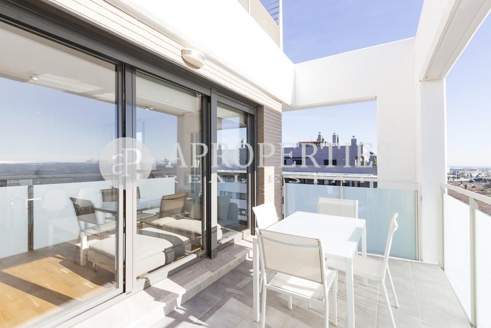 En una de las zonas privilegiadas de la ciudad de Valencia, próxima a la Ciudad de las Artes y las Ciencias, tenemos este ático maravilloso con vistas al mar y a la típica “huerta Valenciana”. La vivienda posee un acogedor salón comedor acristalado, decorado en tonos nude que aporta serenidad y calidez al conjunto, salón que da paso a una amplia terraza con mesas y sillas por tanto ofrece la posibilidad de desayunar, comer o cenar en la misma. La cocina se encuentra completamente equipada, microondas, lavavajillas, menaje para entrar a vivir, etc. Que da paso a una zona de lavadero que comunica con la terraza anteriormente citada. Consta de 3 dormitorios, 2 dobles y uno individual, y dos cuartos de baño, uno de ellos en suite. Todas las habitaciones son exteriores, con amplio ventanales, y por tanto muy luminosas. En ellas armarios empotrados y vestidos. Calefacción de gas natural y aire acondicionado frío -calor por conductos. El ático se encuentra en una urbanización familiar y tranquila, con piscina privada y zona de juegos para los niños. Situada a escasos minutos de la ciudad de la justicia, y del centro comercial el Saler, rodeada de zonas verdes, comercios, bares y restaurantes y a escasos minutos de la Ciudad de las Artes y las Ciencias, de entorno tranquilo y acogedor, ideal para vivir y descansar, por tanto no dude en solicitar una visita y estaremos encantados de mostrársela.