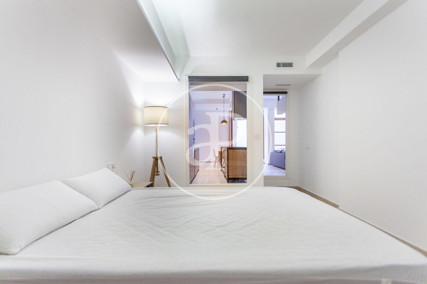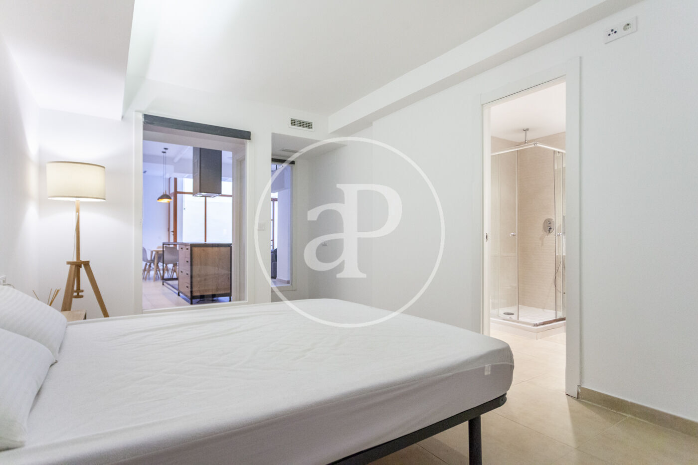 A continuación, un precioso loft con salida directa a un patio privado aporta luz natural y un ambiente acogedor, con dos amplias habitaciones sus respectivos cuartos de baño completos y grandes ventanales .