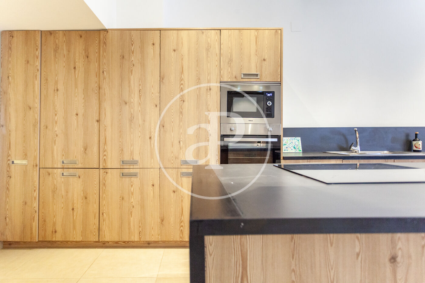 La vivienda cuenta con acabados de alta calidad, como suelos de gres porcelánico, armarios empotrados en roble, carpintería exterior de madera con Climalit, grifería y sanitarios Roca, así como cocina completamente equipada con electrodomésticos y encimera de Silestone.