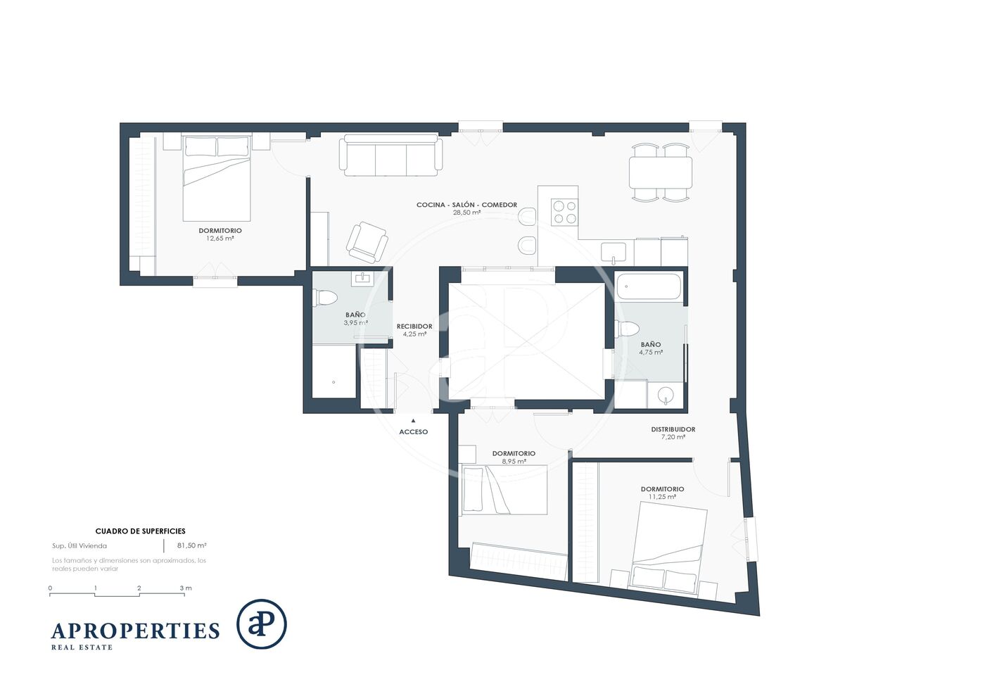 aProperties se complace en presentar este fantástico piso completamente reformado, que cuenta con una espectacular cocina de diseño con salida a una terraza, además de tres habitaciones y dos baños completos.
