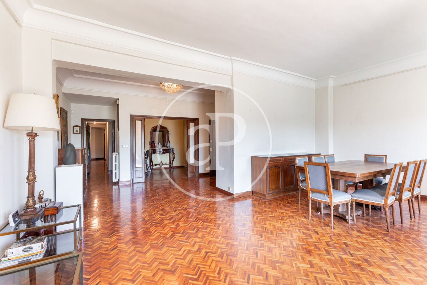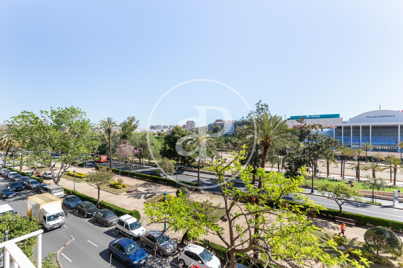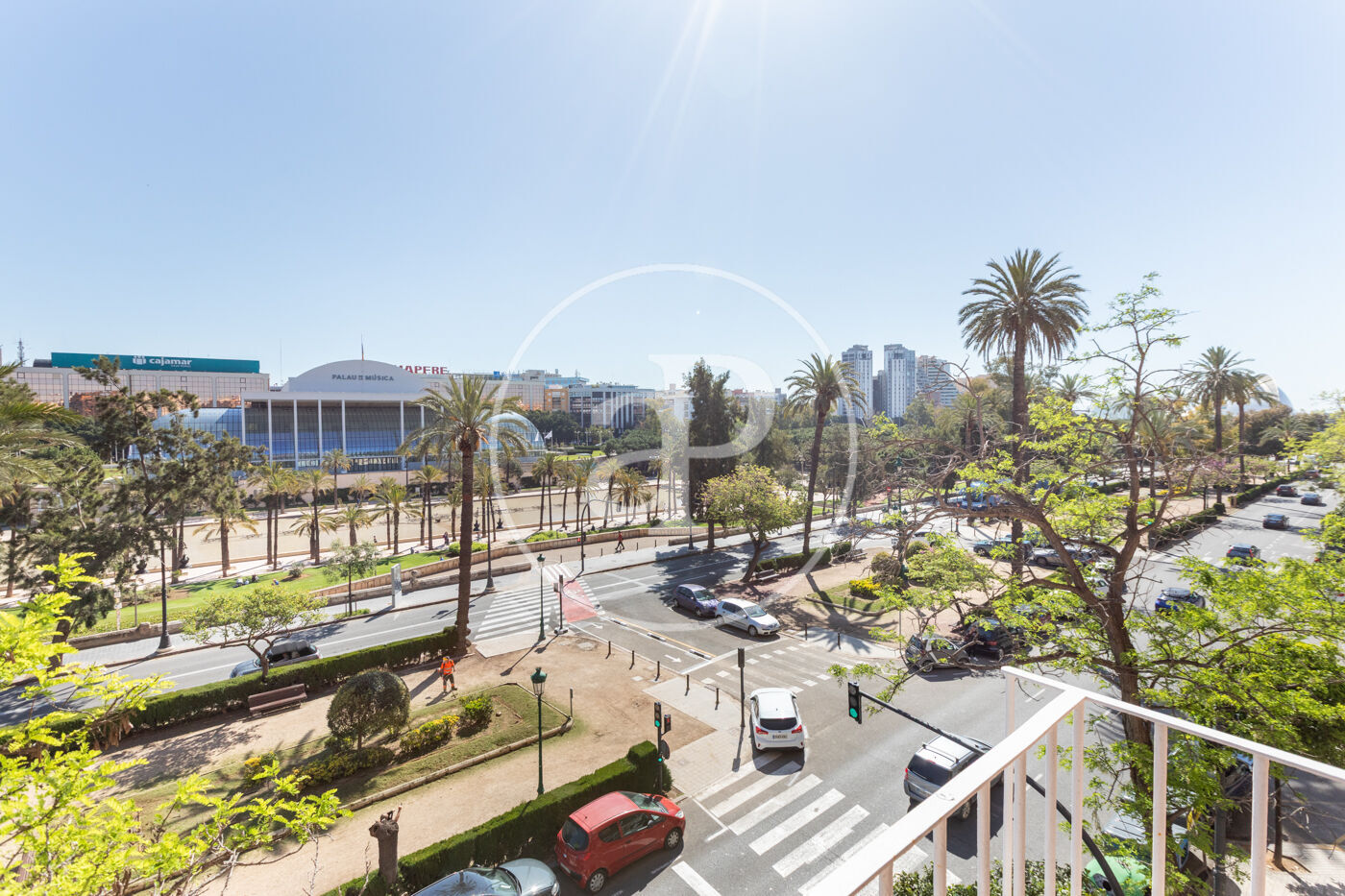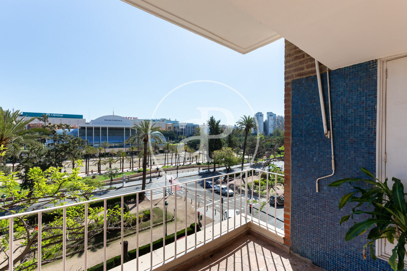 AProperties tiene el placer de presentarles este espectacular piso parcialmente reformado, con terraza, plaza de garaje y unas impresionantes vistas al cauce del río Turia y al Palau de la Música.