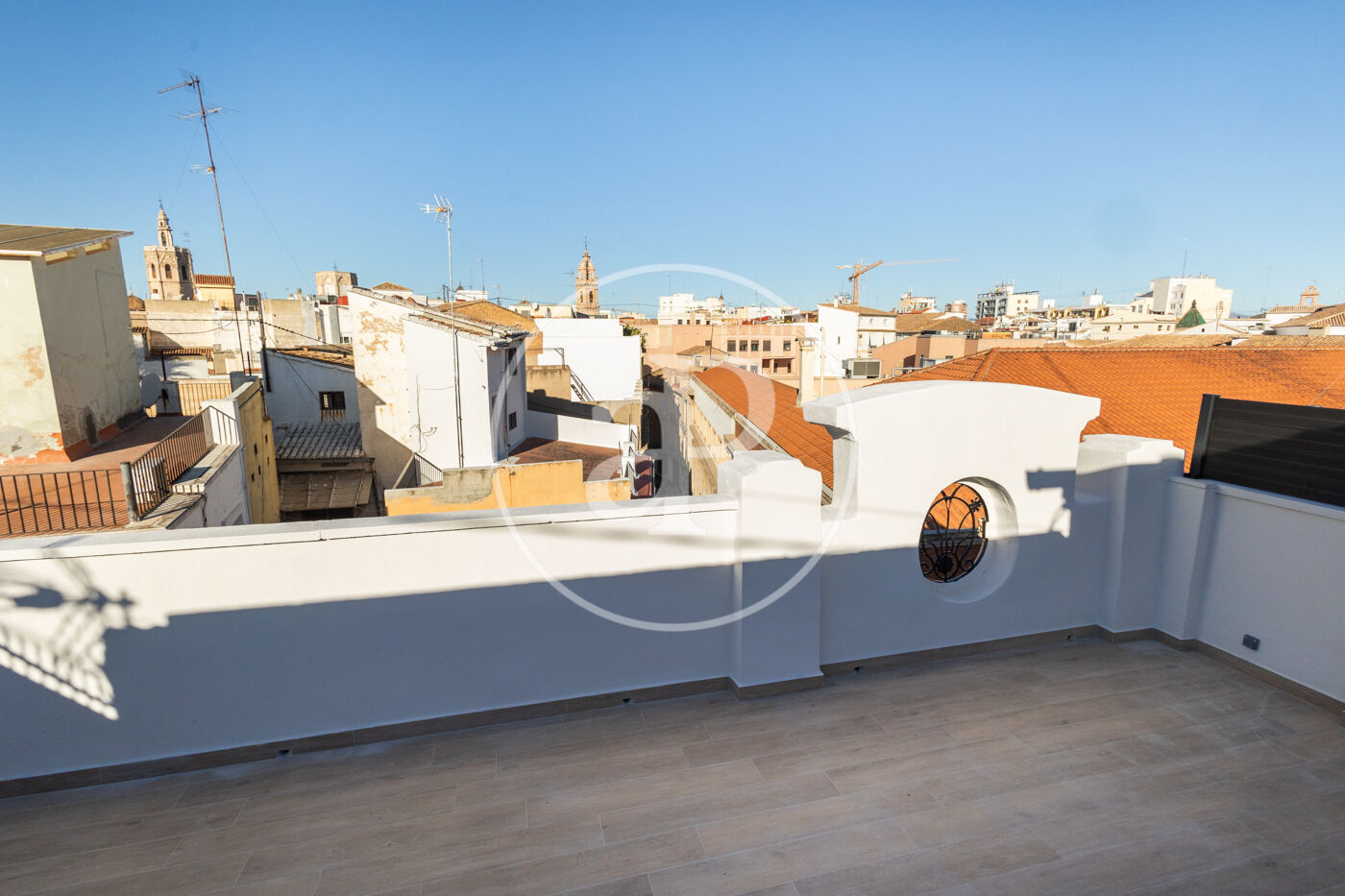 Una de las joyas de esta propiedad es la terraza de 40 metros cuadrados, desde donde se pueden disfrutar vistas impresionantes de la ciudad de Valencia. Este espacio al aire libre es perfecto para cenas al atardecer, reuniones sociales o simplemente relajarse mientras se contempla la ciudad.