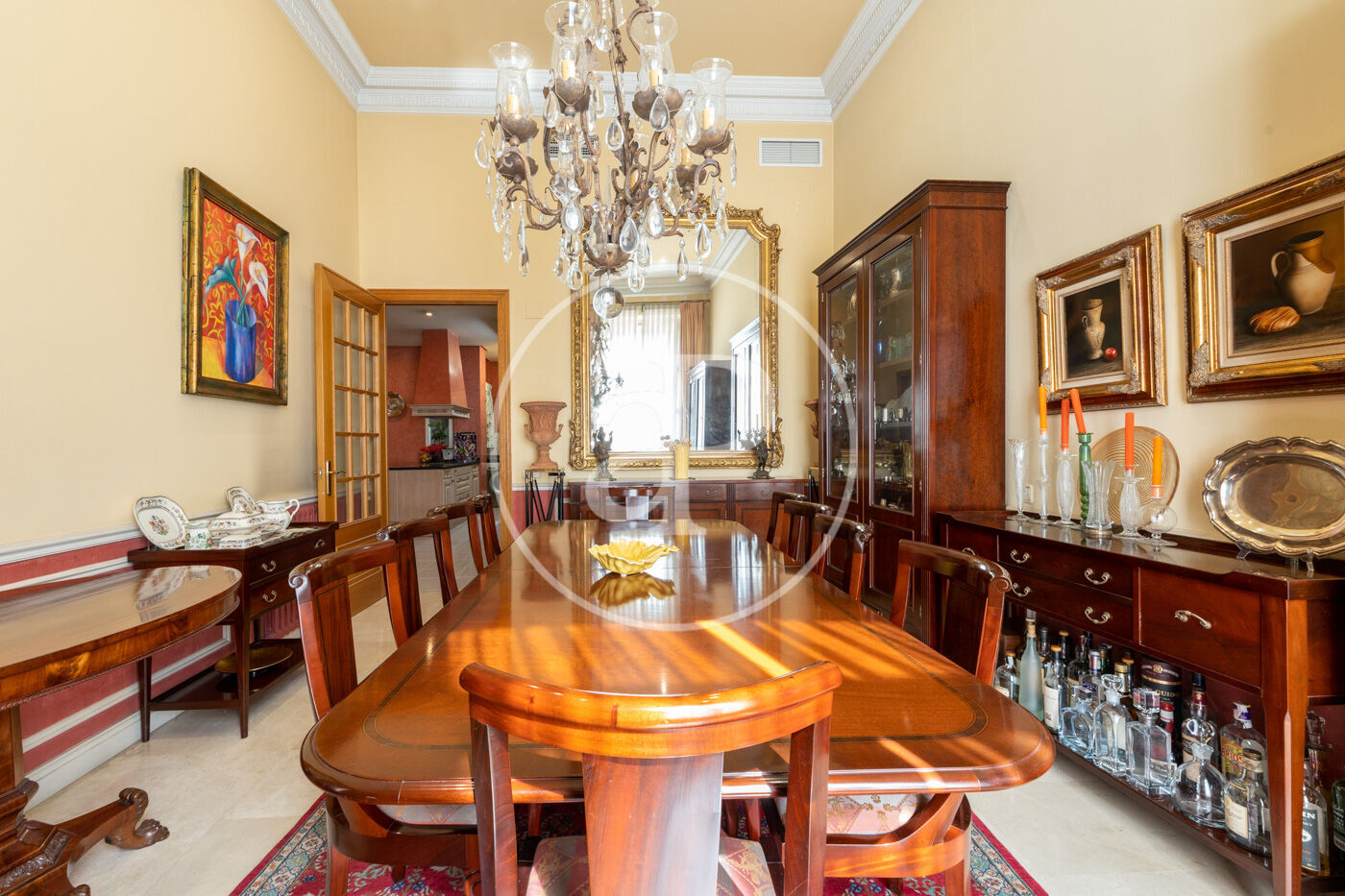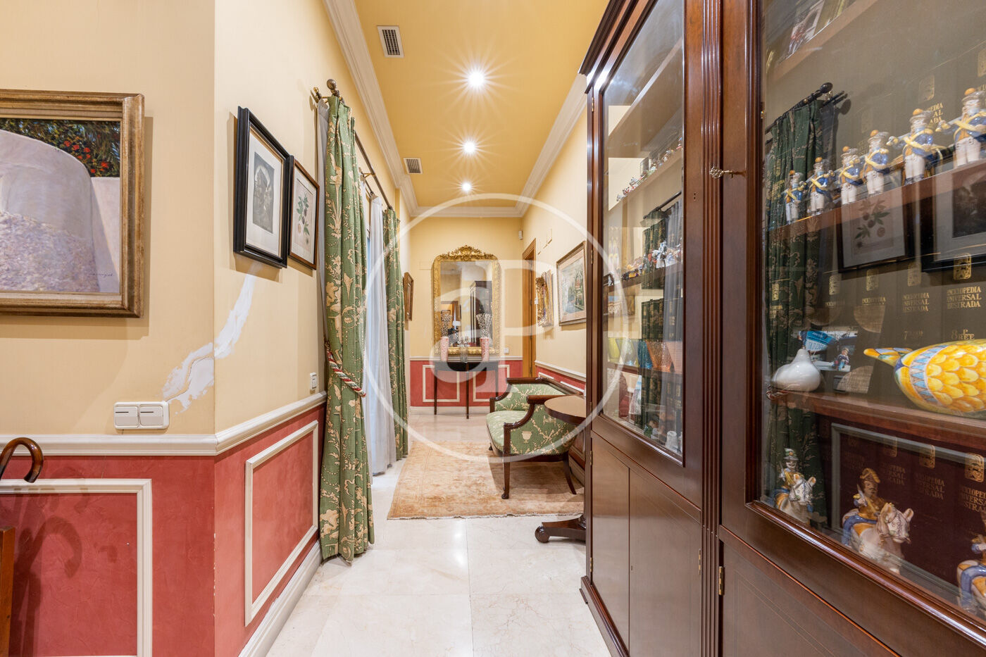 La distribución ha sido diseñada para ofrecer una separación clara entre las zonas de día y de noche. Al acceder, un amplio recibidor con salida a una agradable terraza interior da paso a los distintos espacios. La zona de día, orientada al oeste, cuenta con una gran cocina con espacio para comedor diario y acceso a una galería destinada a zona de lavandería. Desde aquí se accede a un comedor formal con techos de hasta cinco metros de altura y vistas abiertas a la plaza, que conecta a su vez con un espacioso salón principal decorado con elementos arquitectónicos que aportan elegancia y distinción.