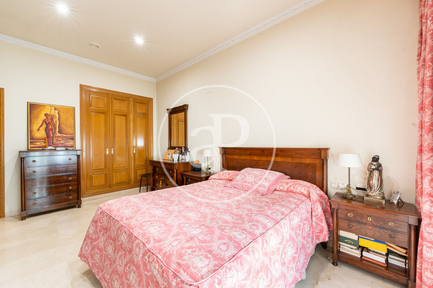 La zona de descanso, orientada al este y con vistas a un tranquilo patio interior, alberga tres dormitorios. El dormitorio principal dispone de baño en suite, mientras que los otros dos comparten un segundo baño completo. La vivienda está equipada con climatización por conductos, calefacción por radiadores de agua caliente con caldera de gas natural y suelos de mármol que añaden un toque de sofisticación y confort.
