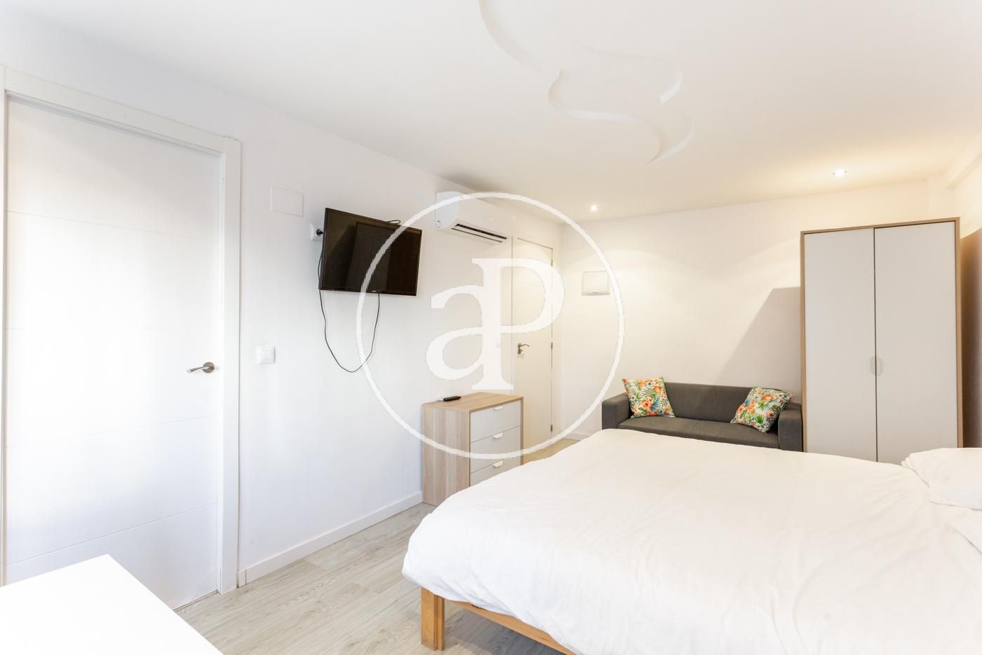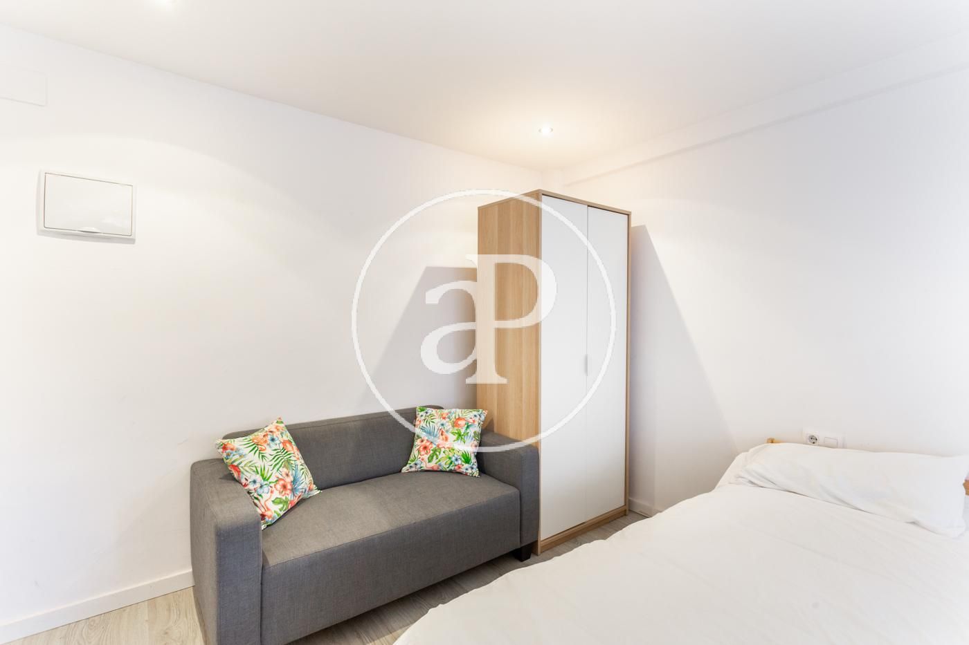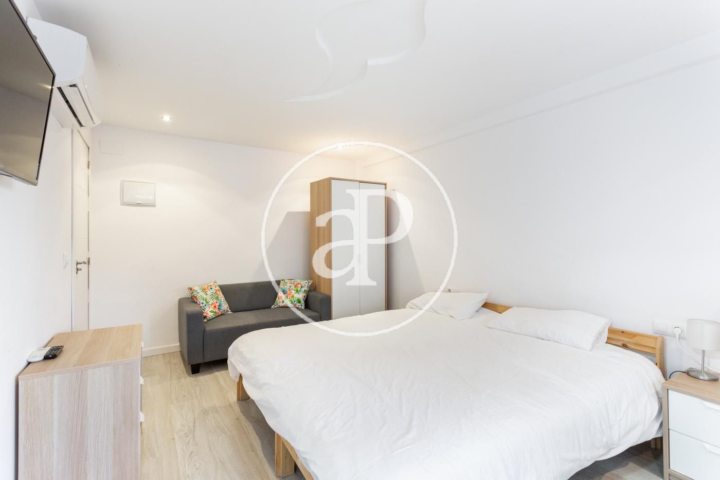 El piso se compone de tres habitaciones que a la vez son mini-pisos, con baño privado cada uno y cocina equipada, y uno de ellos con balcón. A la vez tiene una cocina principal totalmente equipada, concepto abierto unido con un amplio salón comedor con ventanal. Es muy luminosa. Dispone de aire acondicionado frio/calor, en todas las estancias, suelo de parquet, luces mediante sensores.