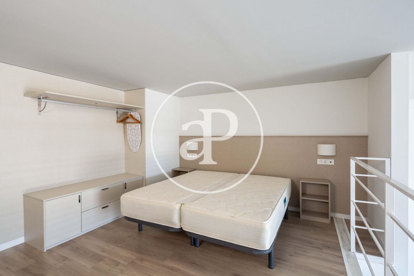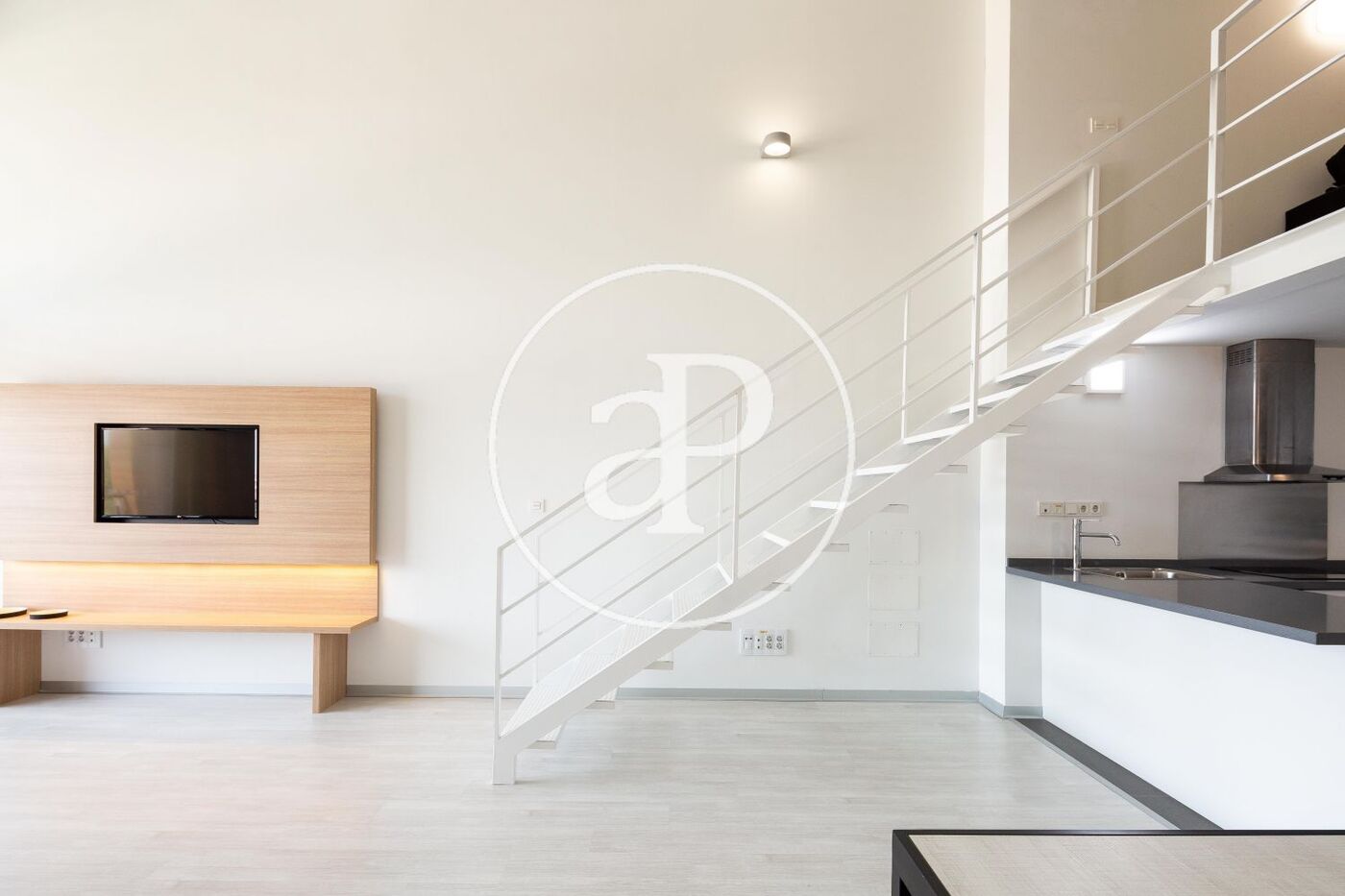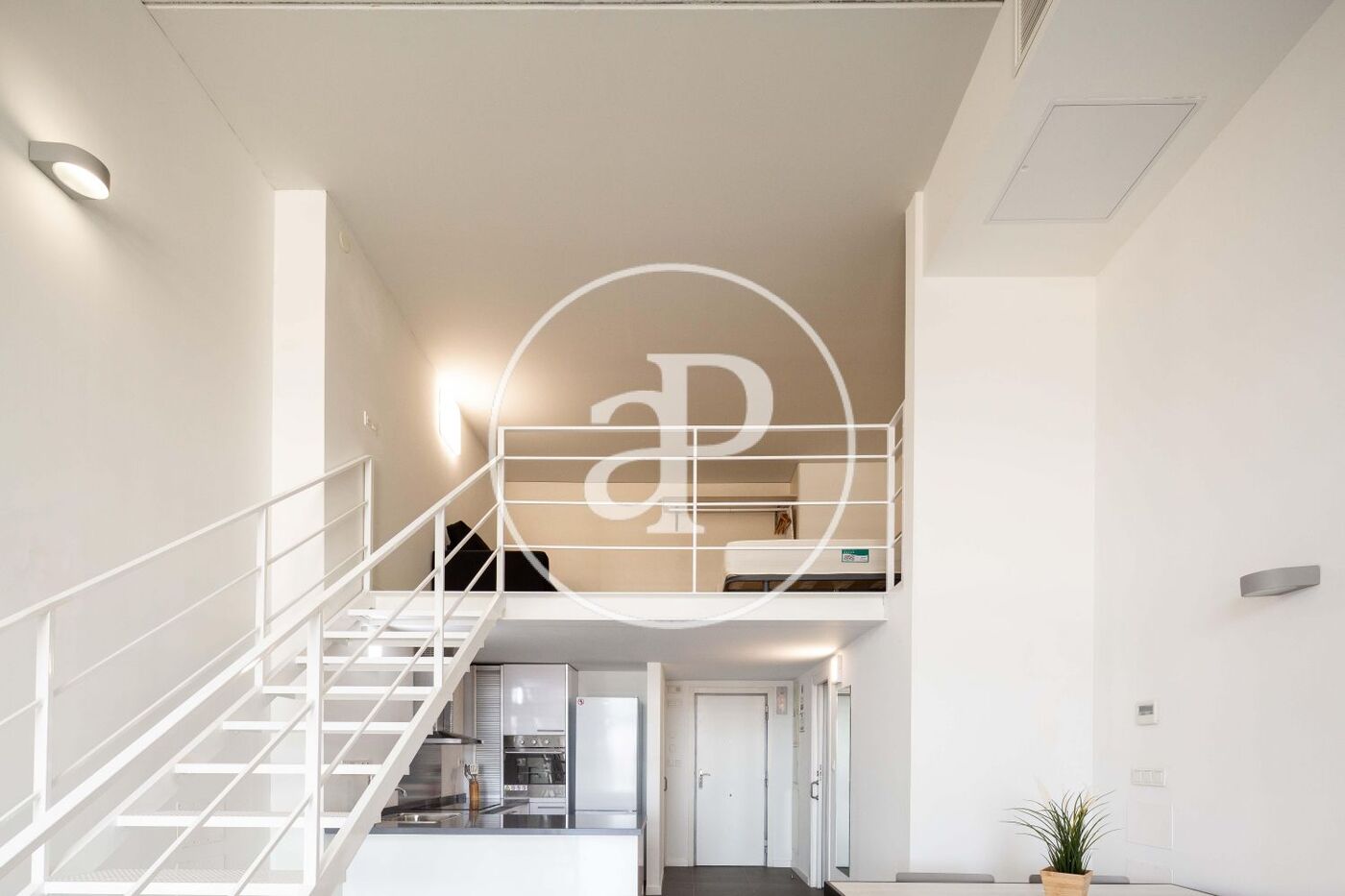 La vivienda está completamente amueblada con muebles de diseño y guardando una línea vanguardista, con líneas blancas y neutras. La planta baja la compone un cuarto de baño con ducha, cocina completamente equipada integrada en el salón que nos da acceso a una amplia terraza. Con los techos altos tenemos gran luminosidad y espacio. En la planta primera se encuentra el dormitorio con cama de matrimonio.