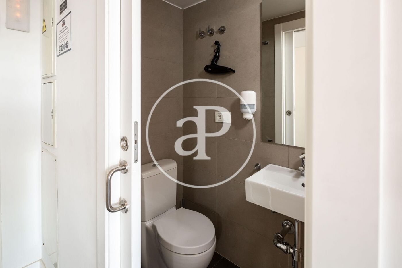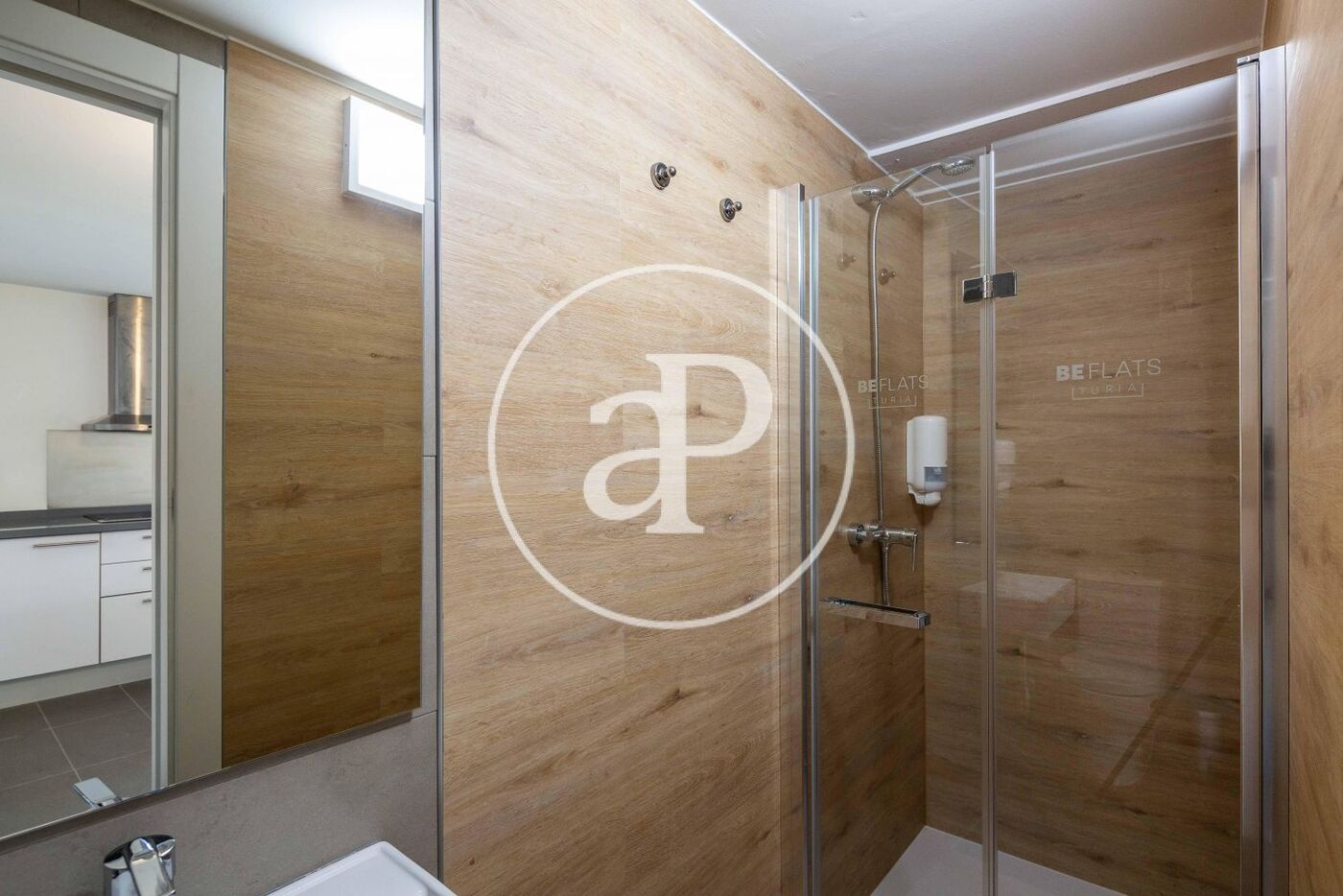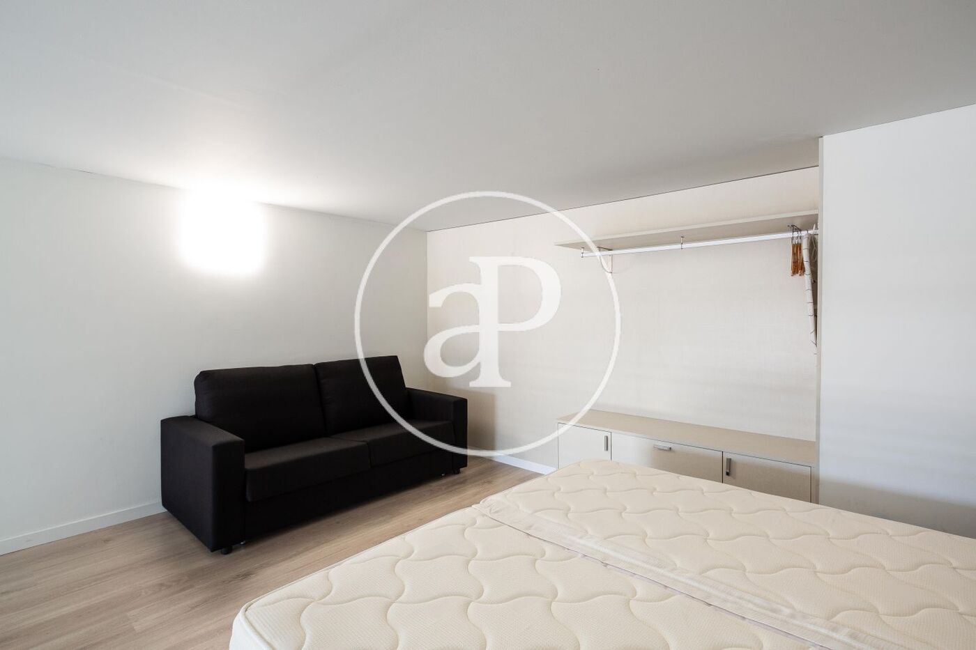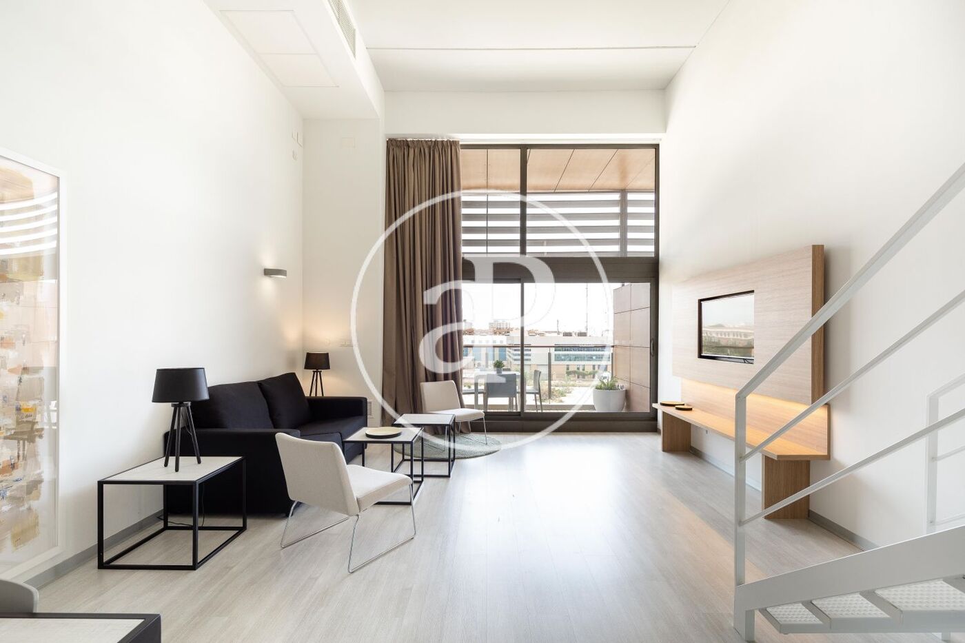 La vivienda está completamente amueblada con muebles de diseño y guardando una línea vanguardista, con líneas blancas y neutras. La planta baja la compone un cuarto de baño con ducha, cocina completamente equipada integrada en el salón que nos da acceso a una amplia terraza. Con los techos altos tenemos gran luminosidad y espacio. En la planta primera se encuentra el dormitorio con cama de matrimonio.