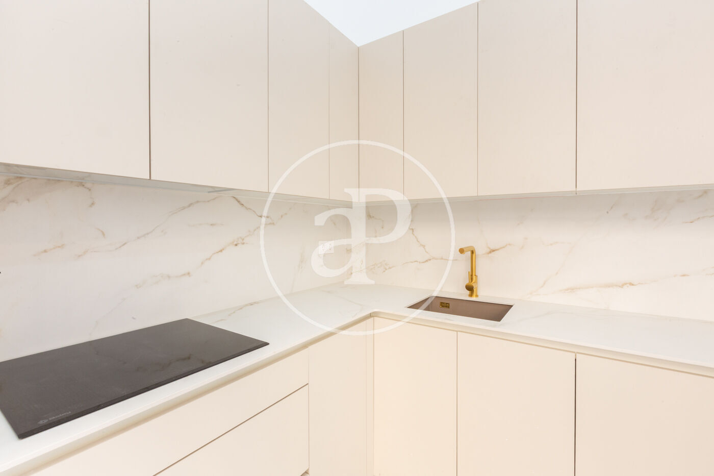 La propiedad se distribuye en un salón-comedor , con cocina integrada y electrodomésticos panelados que aportan una estética limpia y elegante. El espacio abierto, junto con sus techos altos, potencia la sensación de amplitud y luminosidad, creando un ambiente ideal para el día a día.
