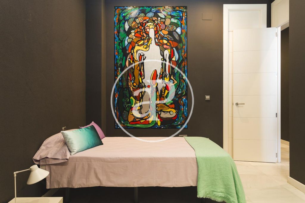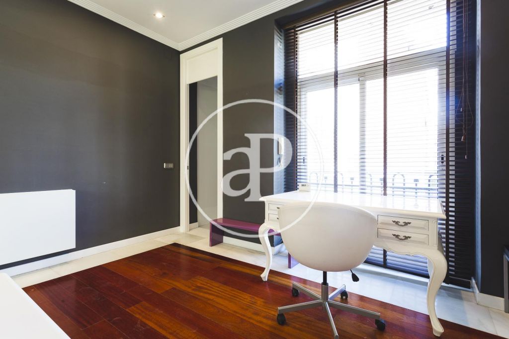Por último, al final del pasillo, se encuentra el dormitorio principal al que se accede directamente a una zona que se puede usar como despacho o vestidor, muy luminosa por su amplio ventanal. Esta zona separa el cuarto de baño completo en suite del dormitorio. El dormitorio es muy espacioso con zona de vestidor, con muchos armarios y tres ventanales que lo hacen muy luminoso.