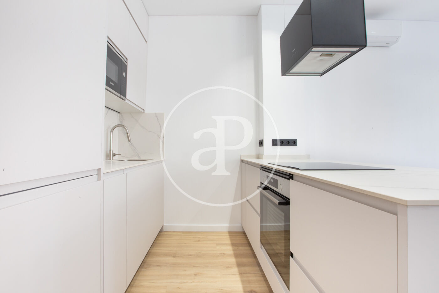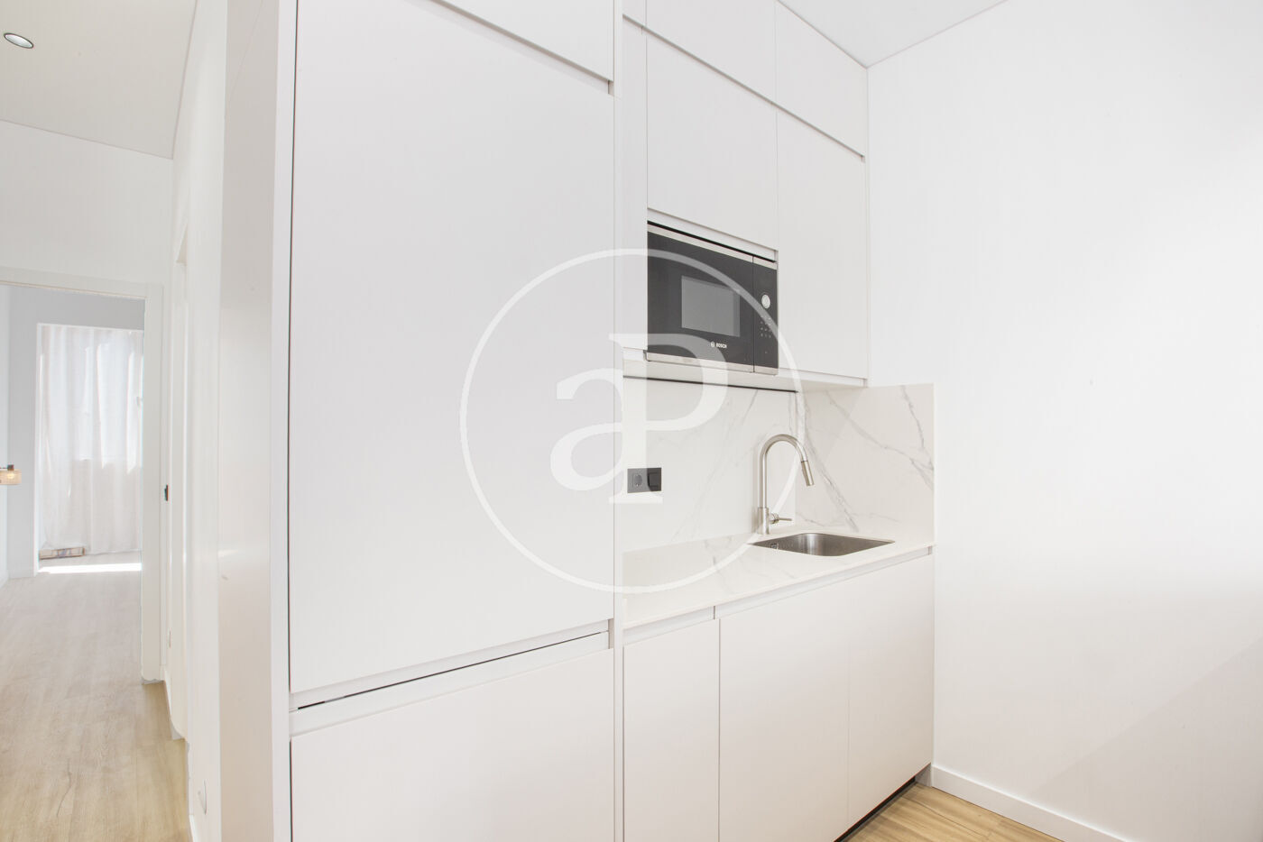 Con unos 62 m² construidos (58 m² útiles), el piso dispone de dos dormitorios, un baño completo, una zona de lavandería integrada y un salón amplio con cocina abierta diseñada por profesionales y equipada con electrodomésticos Bosch.
