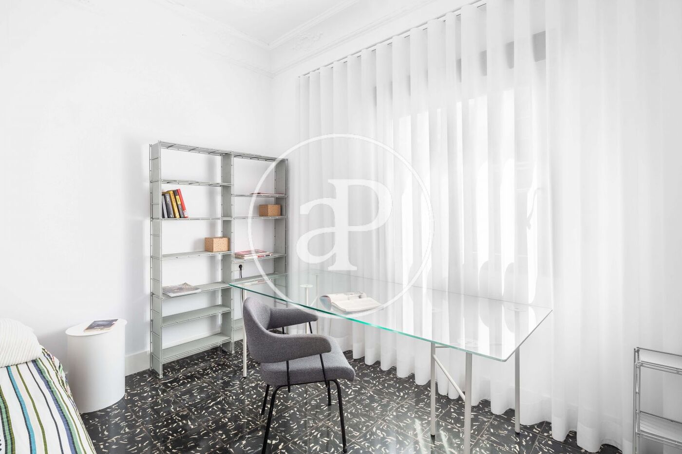 Confortable vivienda reformada a estrenar en el exclusivo barrio de Ruzafa. En la propiedad se ha llevado a cabo una reforma íntegra por un arquitecto en la que se ha utilizado materiales de gran calidad. La vivienda es muy luminosa debido a su extraordinaria orientación, Sur-Este y su magnífica altura (un quinto piso). Además, la altura de sus techos contribuye a crear una sensación mayor de amplitud. Cuenta con una excelente distribución compuesta por un amplio salón comedor en dos ambientes con cocina integrada ( concepto open plan ) el cual tiene ventanales con vistas despejadas. La cocina disfruta de una galería que asoma a un patio interior donde se ubica el lavadero. Ha sido diseñada completamente a medida y se encuentra equipada con electrodomésticos Bosch y encimera de Neolit.