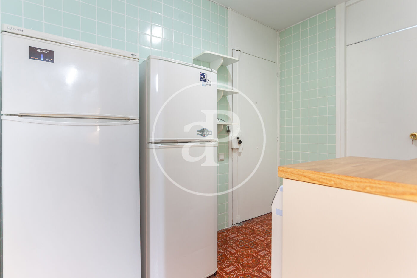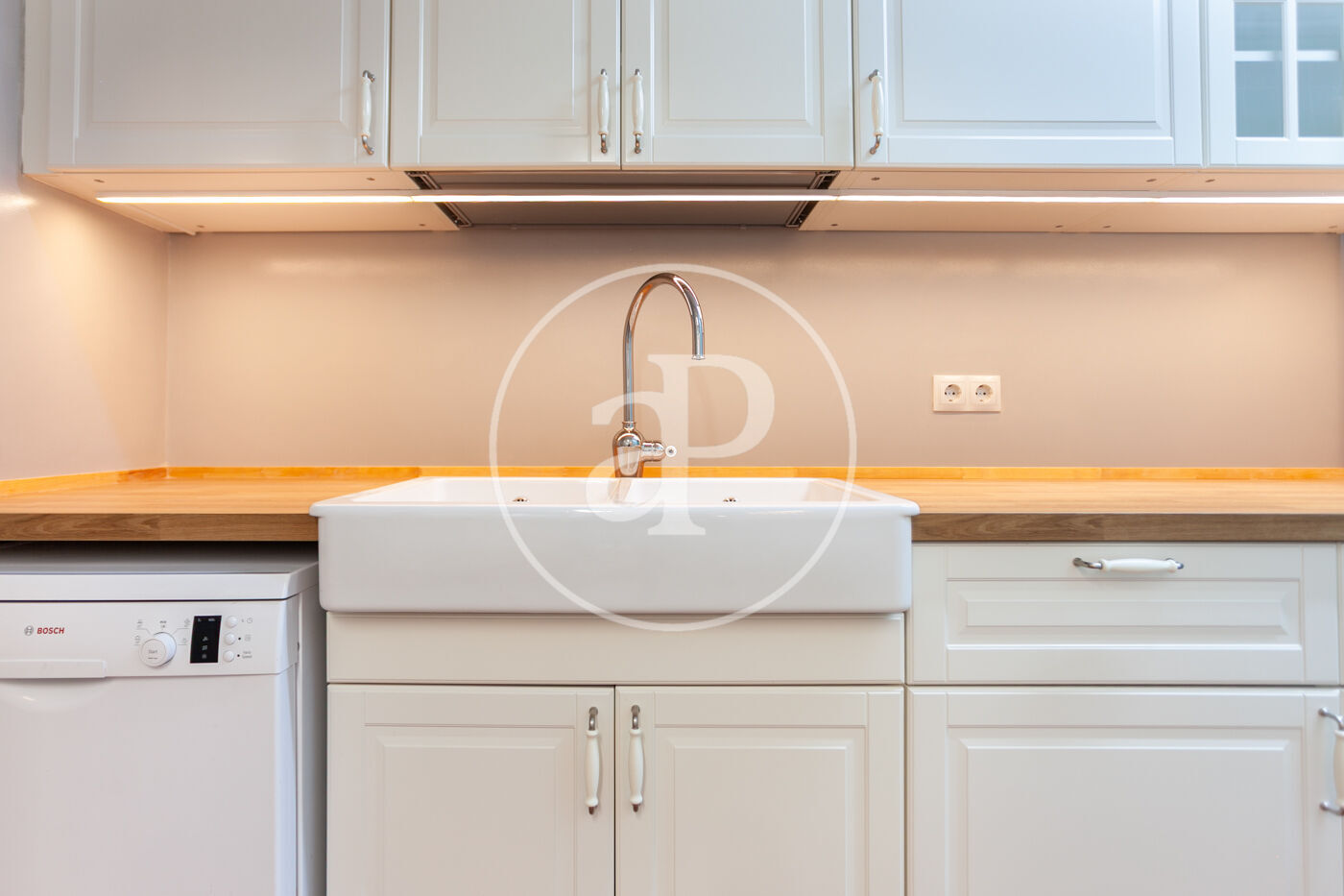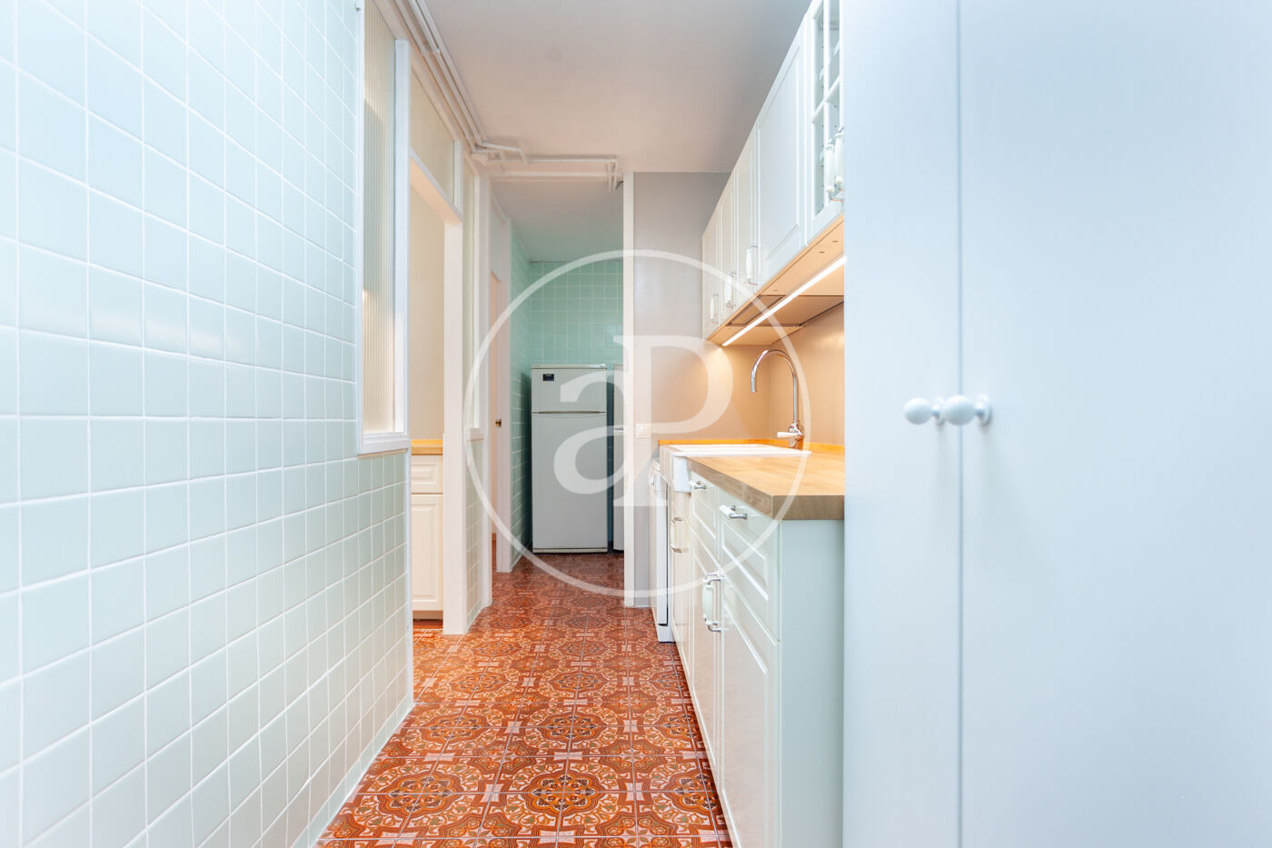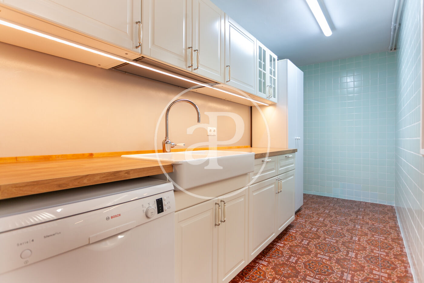 En la parte final de la vivienda se encuentra la espectacular cocina, completamente reformada en elegantes tonos blancos. Está equipada con todos los electrodomésticos, cocina de gas ciudad, una zona de comedor, un aseo, una pequeña terraza y un práctico espacio de lavandería.