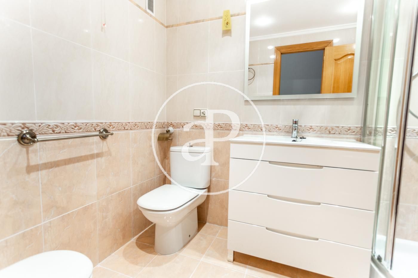 Dispone de dos baños completos con ducha. Actualmente el piso tiene 3 dormitorios después de una reestructuración de la vivienda, y en uno de ellos se tiró el tabique pero se mantuvieron las dos puertas para acceder al dormitorio.