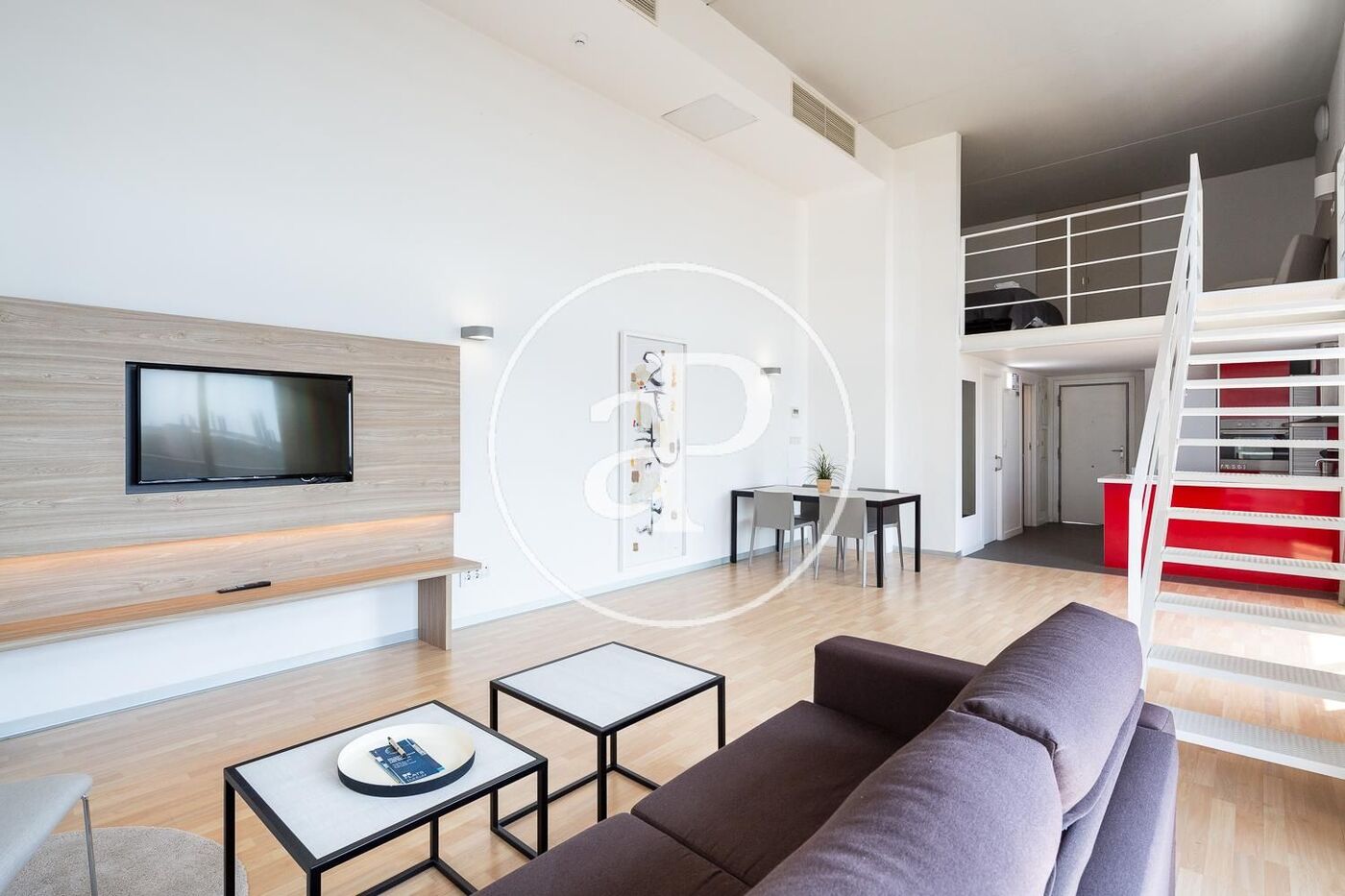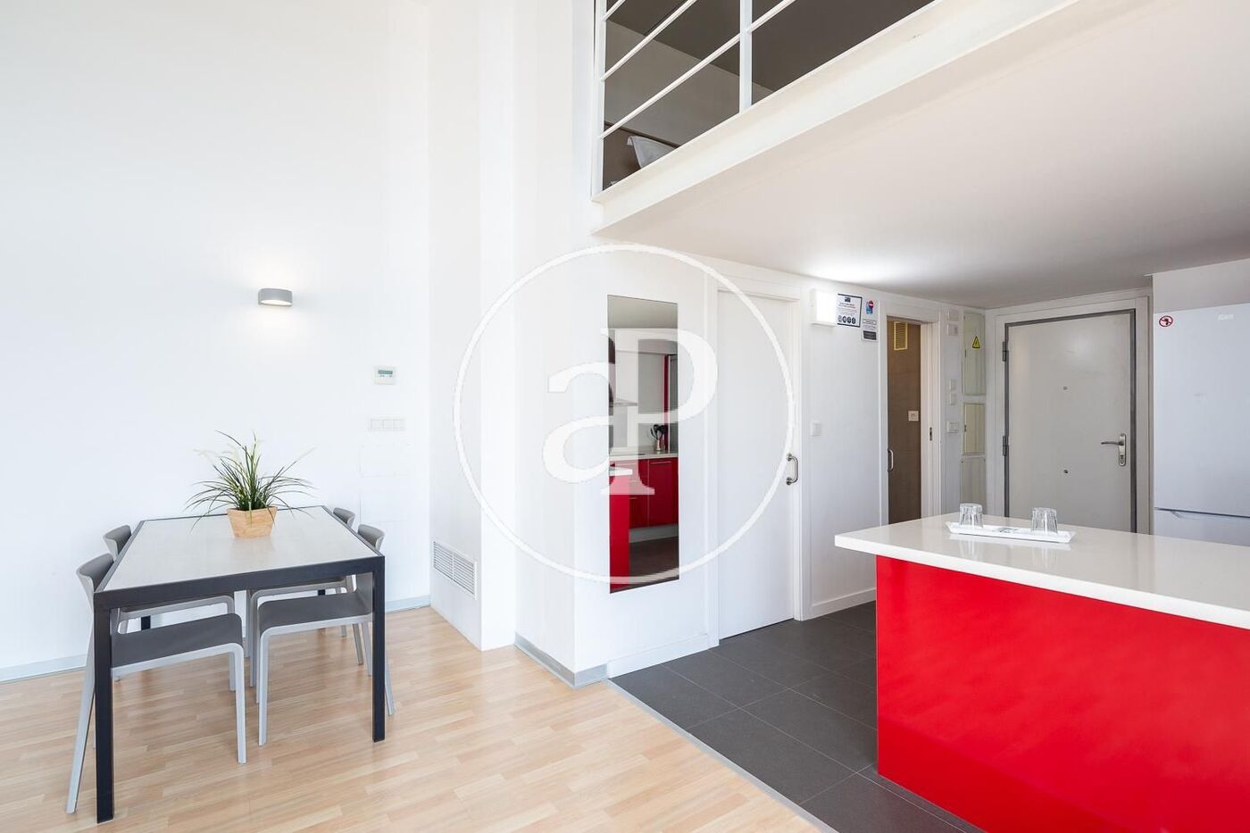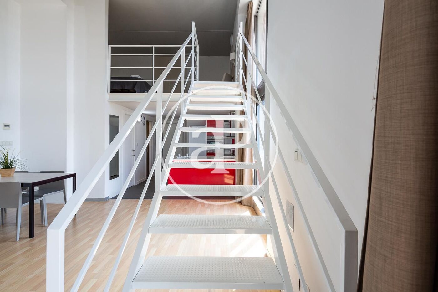 La vivienda está completamente amueblada con muebles de diseño y guardando una línea vanguardista, con líneas blancas y neutras. La planta baja la compone un cuarto de baño con ducha, cocina completamente equipada integrada en el salón que nos da acceso a una amplio balcón. Con los techos altos tenemos gran luminosidad y espacio. En la planta primera se encuentra el dormitorio con cama de matrimonio.